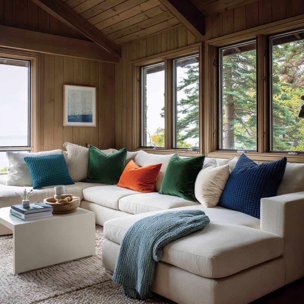 - Echoing in the room: pillow tones repeated in small decor—ceramic, wood, metal—so the sofa belongs to the space
