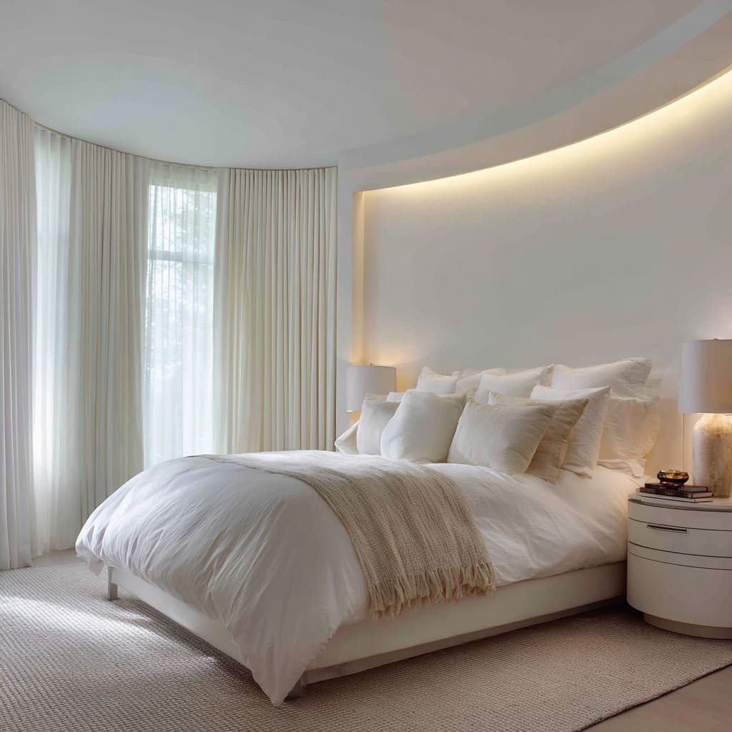 Every successful design tells a simple organizing story that the eye can summarize in a breath. A long horizontal light ribbon sets the pillow height and stretches the wall; an arched recess frames the bed and throws a crescent shadow that makes the headboard look brighter; a pearly plane folds from wall to ceiling and turns movement into gradients; a round skylight drops a soft cone that silvers every textile in reach; a floating platform repeats the ceiling’s hover so the bed reads composed from any angle.