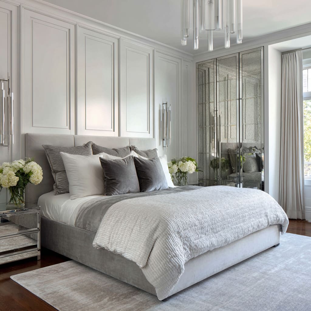 This is where silver white bedroom ideas feel effortless: the cool field carries the look, the warm notes stop it from feeling remote.