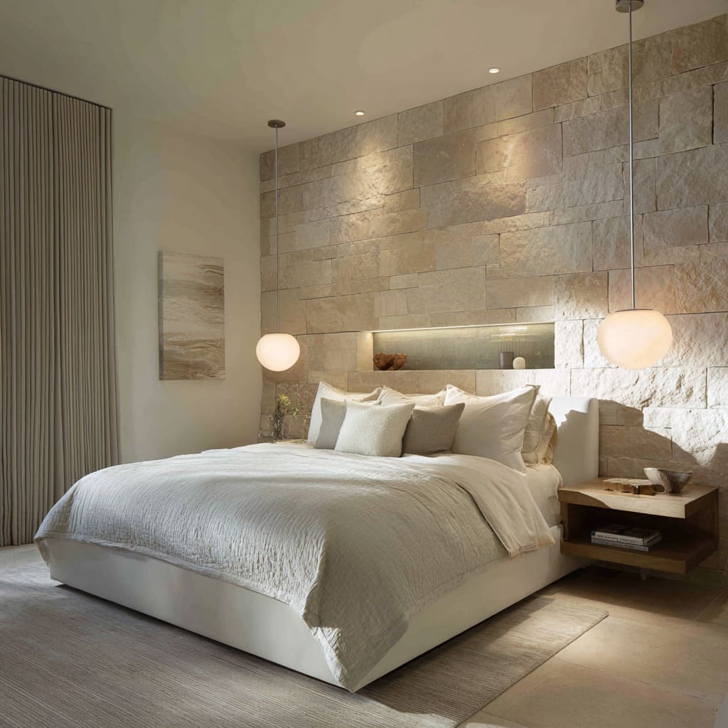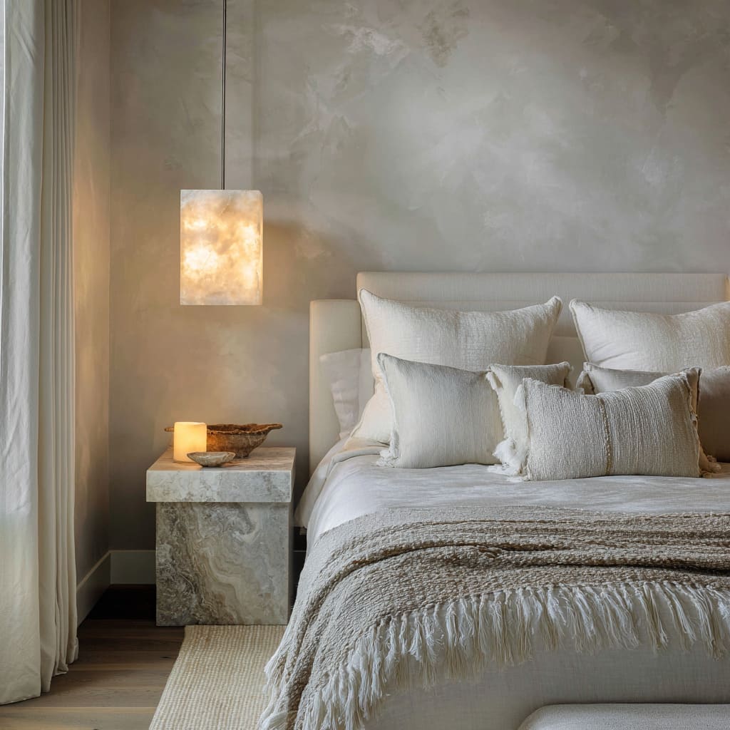 Lime-washed plaster, limestone blocks, onyx-veined nightstands, woven pendants; reflection is absorbed into stone and soft textiles, so the glow feels grounded.