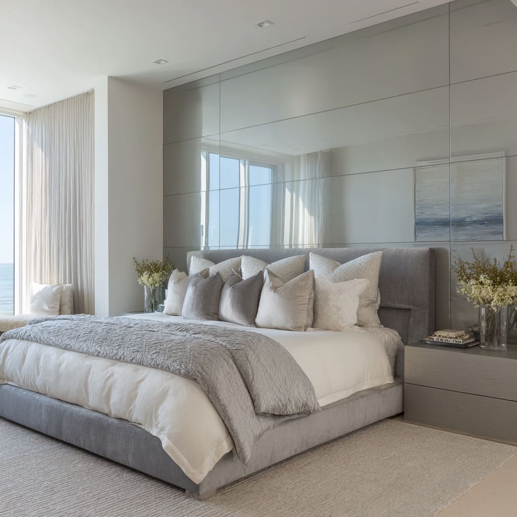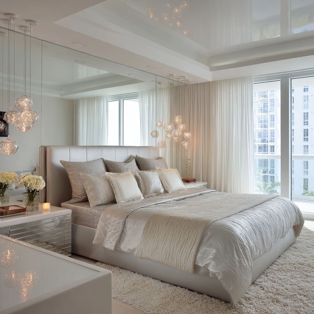 Mirrors never appear as random rectangles; they flank, frame, or soften. Antiqued doors add a smoky repeat of the room; beaded frames turn points of light into a delicate constellation; tall pairs stop just above the pillow crest to widen the bed without crowding the ceiling; full-height sheets behind the bed borrow ceiling forms and pendant clusters to make the architecture feel richer.