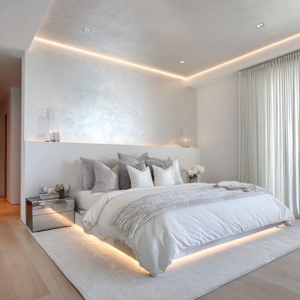 Light isn’t an accessory here; it’s part of the composition. A hidden line above a headboard becomes a datum that pillows climb to meet; a soft perimeter strip under the bed makes the mattress look lighter; a ceiling cove wraps the room in a low, even glow; and a round skylight drops daylight in a cone that turns every textile slightly silver.
