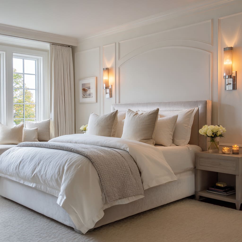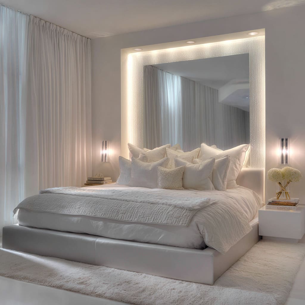 The best white and silver bedroom designs are built on restraint: big shapes stay matte and softly textured so small glints can do the expressive work, and the eye moves in a slow line from the headboard field to the bed crest to the edges of lighting and mirror seams. This is why a room can feel luminous without feeling glossy—silver behaves, white hosts, and the composition lets both roles stay legible.