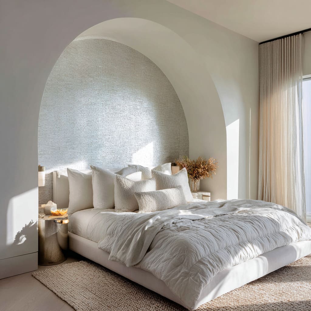 Curved walls, arched recesses, padded canopies, and shallow overhead frames give the bed a home inside the room, and the silver notes gather where the form changes. A cove along a gentle arc reads like a horizon at dusk; a mosaic-lined niche scatters daylight into a soft sparkle; a padded canopy edged with a slim metallic line sets a precise stop for the eye; and twin mirrors flanking the headboard widen the field without adding extra objects.