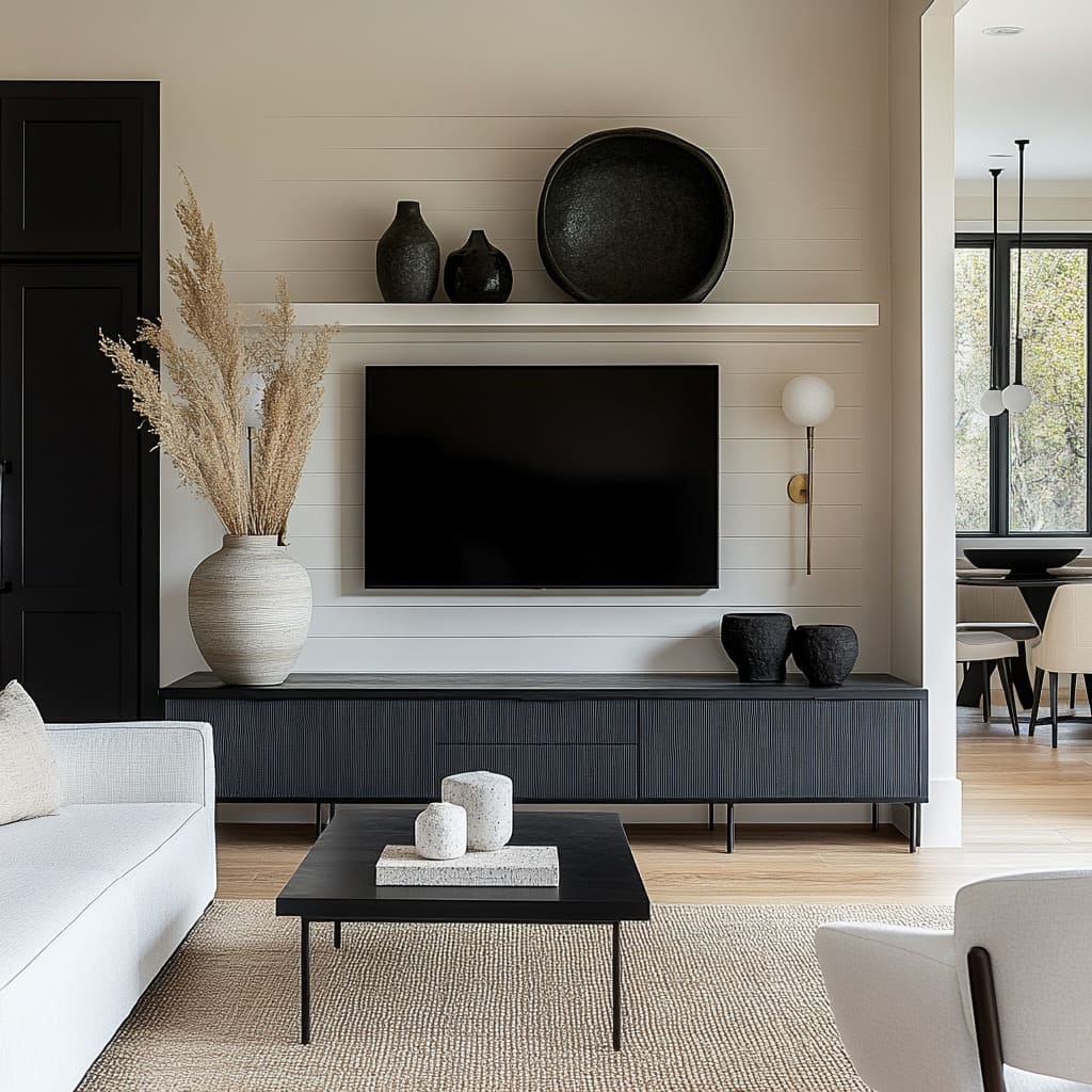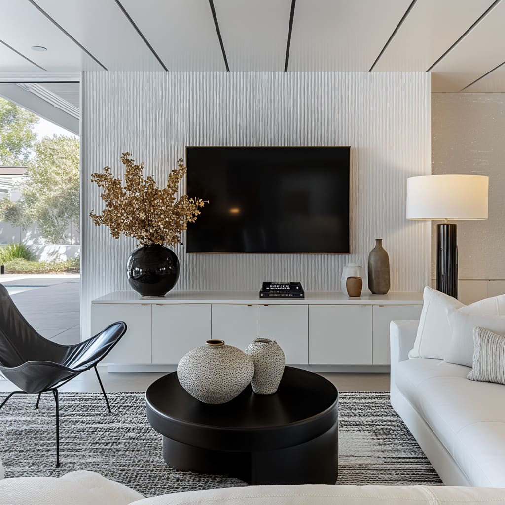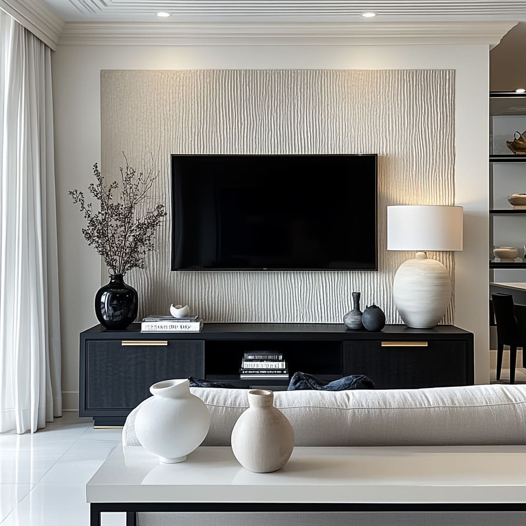 The entire atmosphere of a black white living room design is often decided long before sofas and cushions are chosen; it is set by the wall that carries the TV, fireplace, or main storage. That surface behaves less like a plain background and more like a structured canvas that holds the whole composition together.