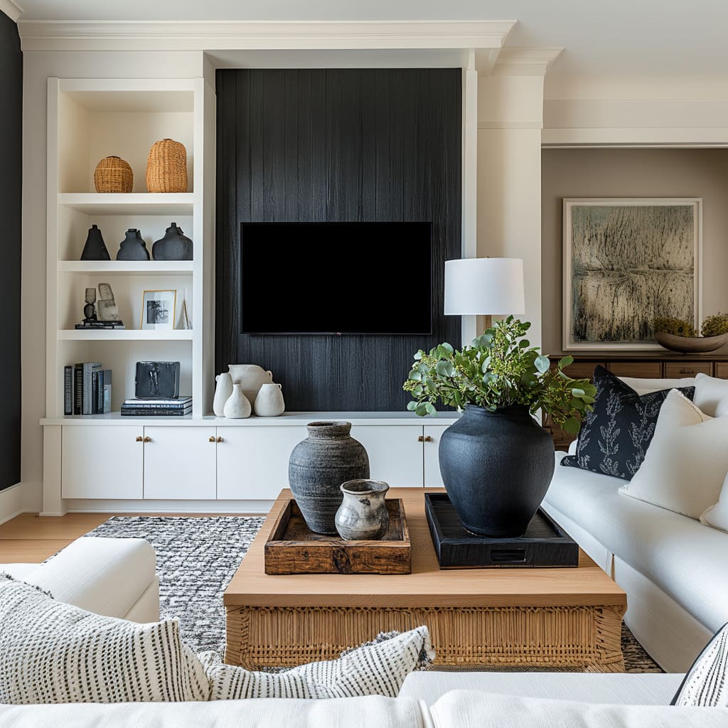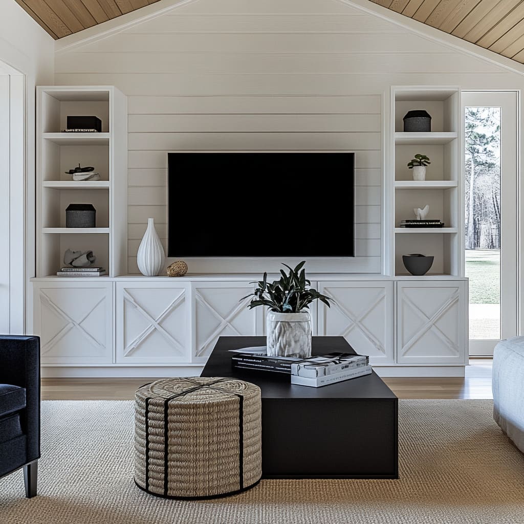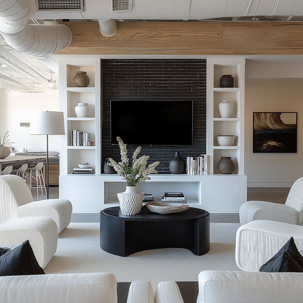 The entire atmosphere of a black white living room design is often decided long before sofas and cushions are chosen; it is set by the wall that carries the TV, fireplace, or main storage. That surface behaves less like a plain background and more like a structured canvas that holds the whole composition together.