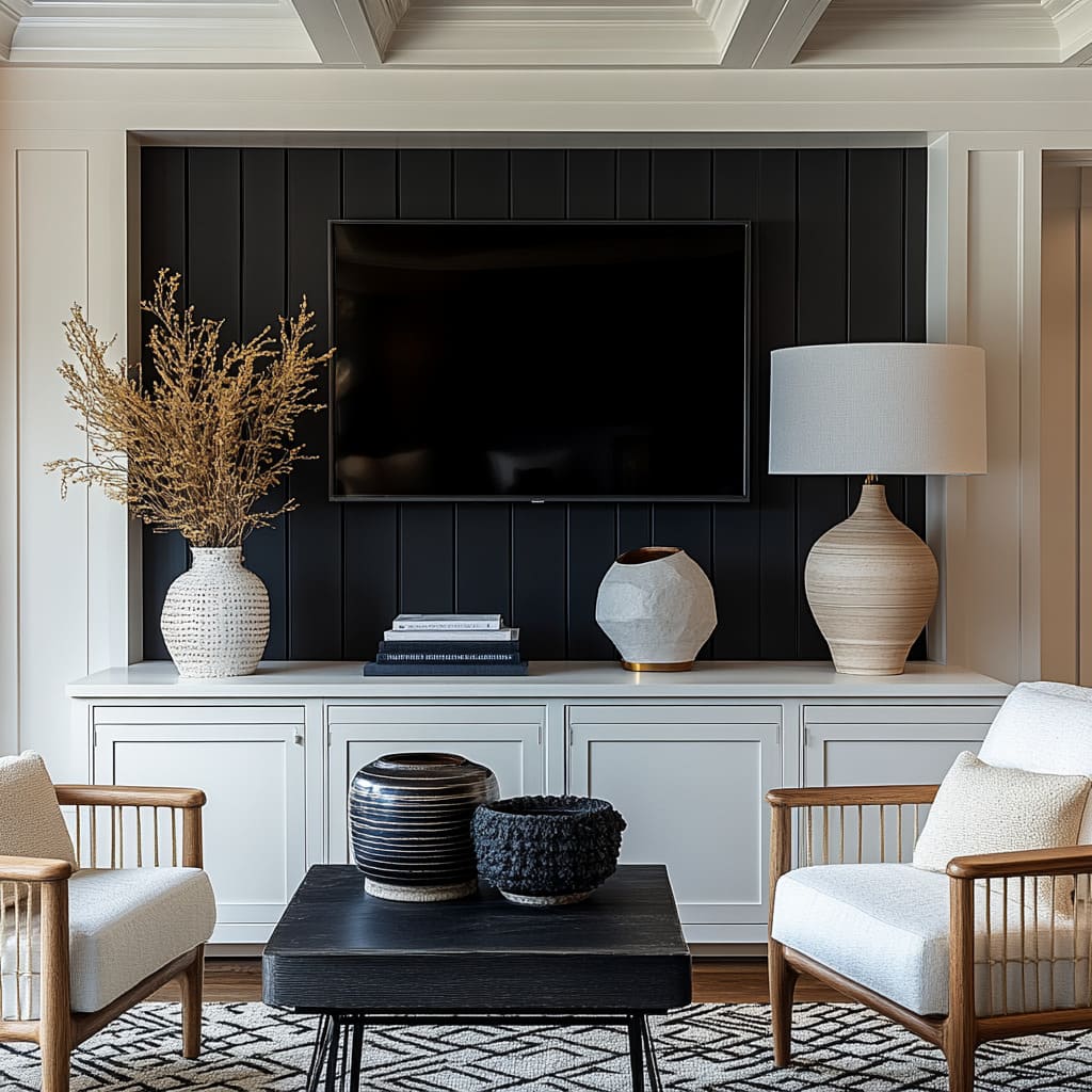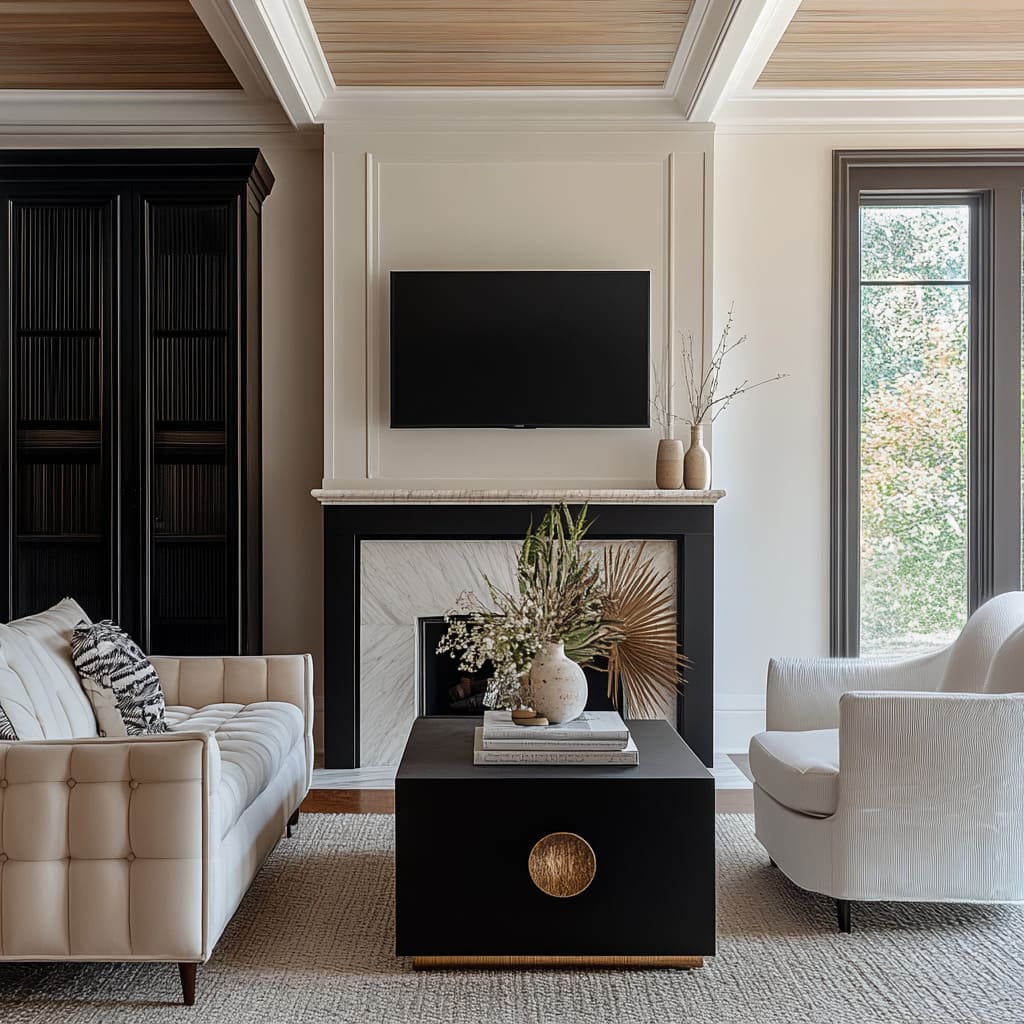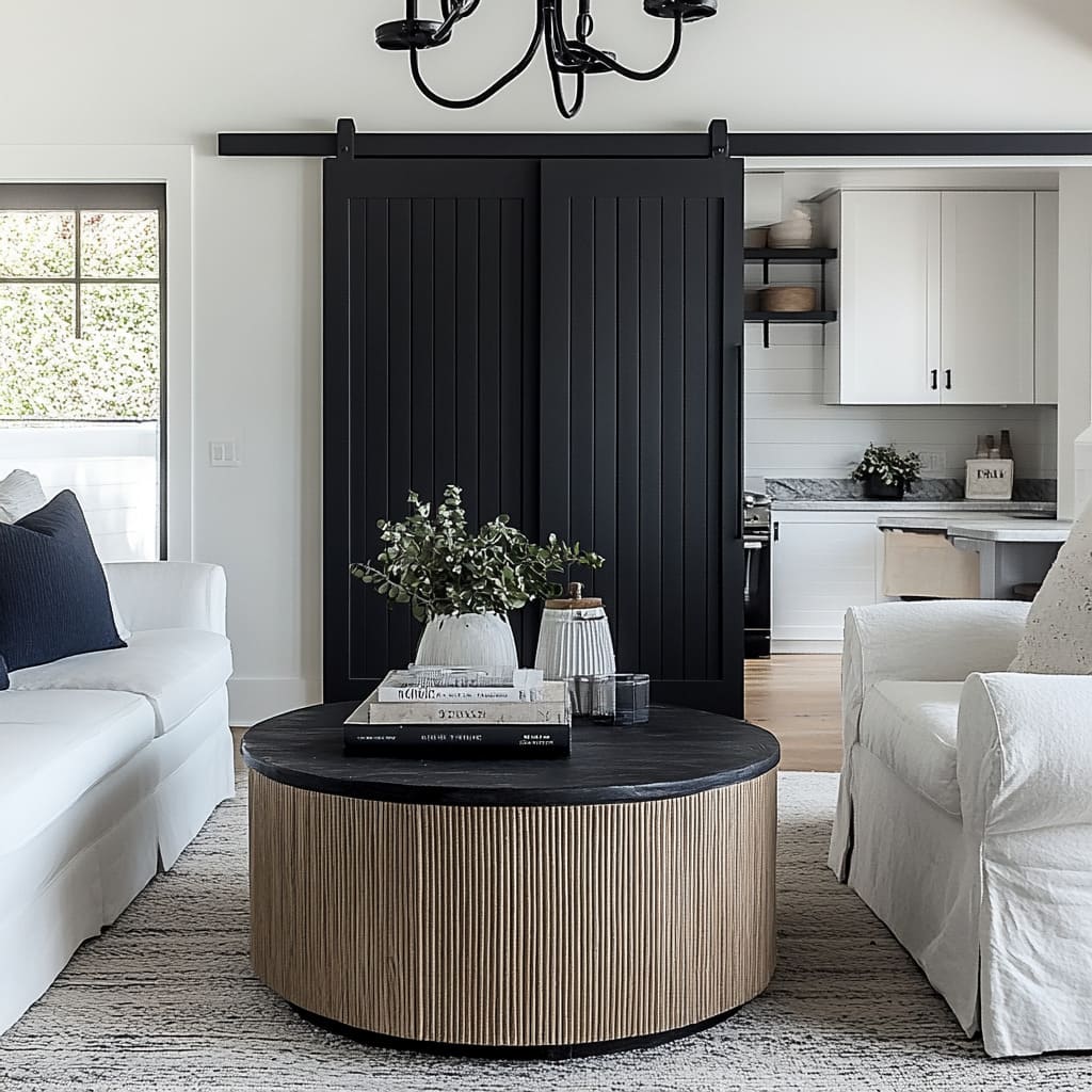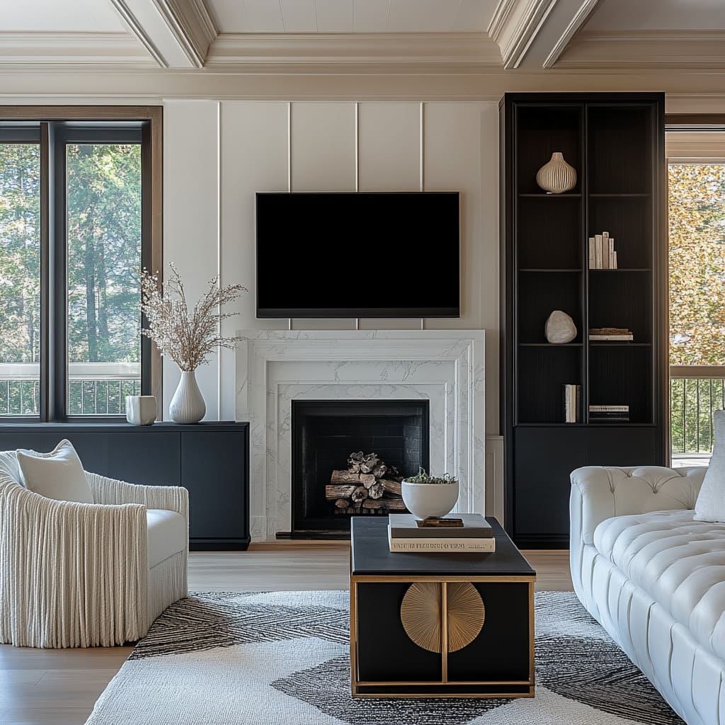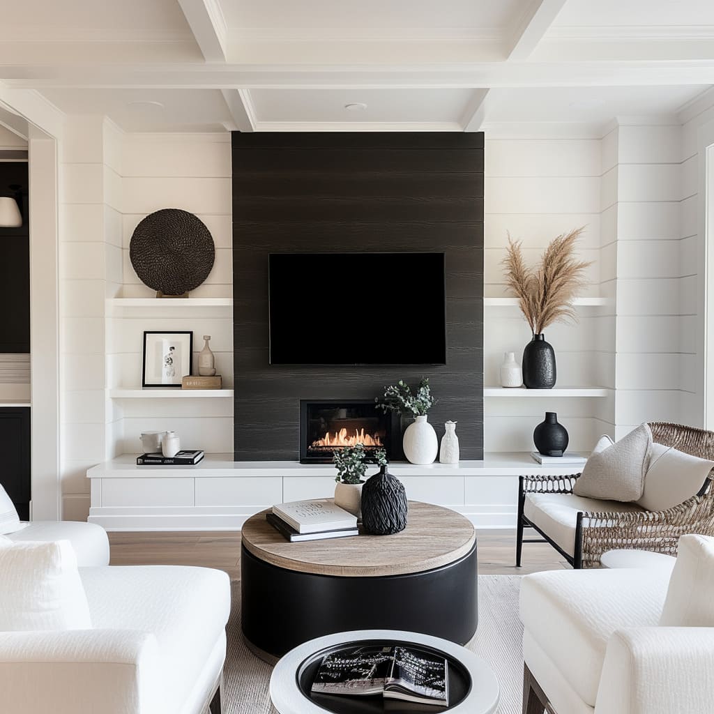 A recurring idea in simple black and white living room ideas is that black is treated like a space rather than just a color. Charcoal panel walls, black brick insets, dark barn doors, or inky fireplace boxes act like pockets of depth—visually receding so that light furniture can step forward.