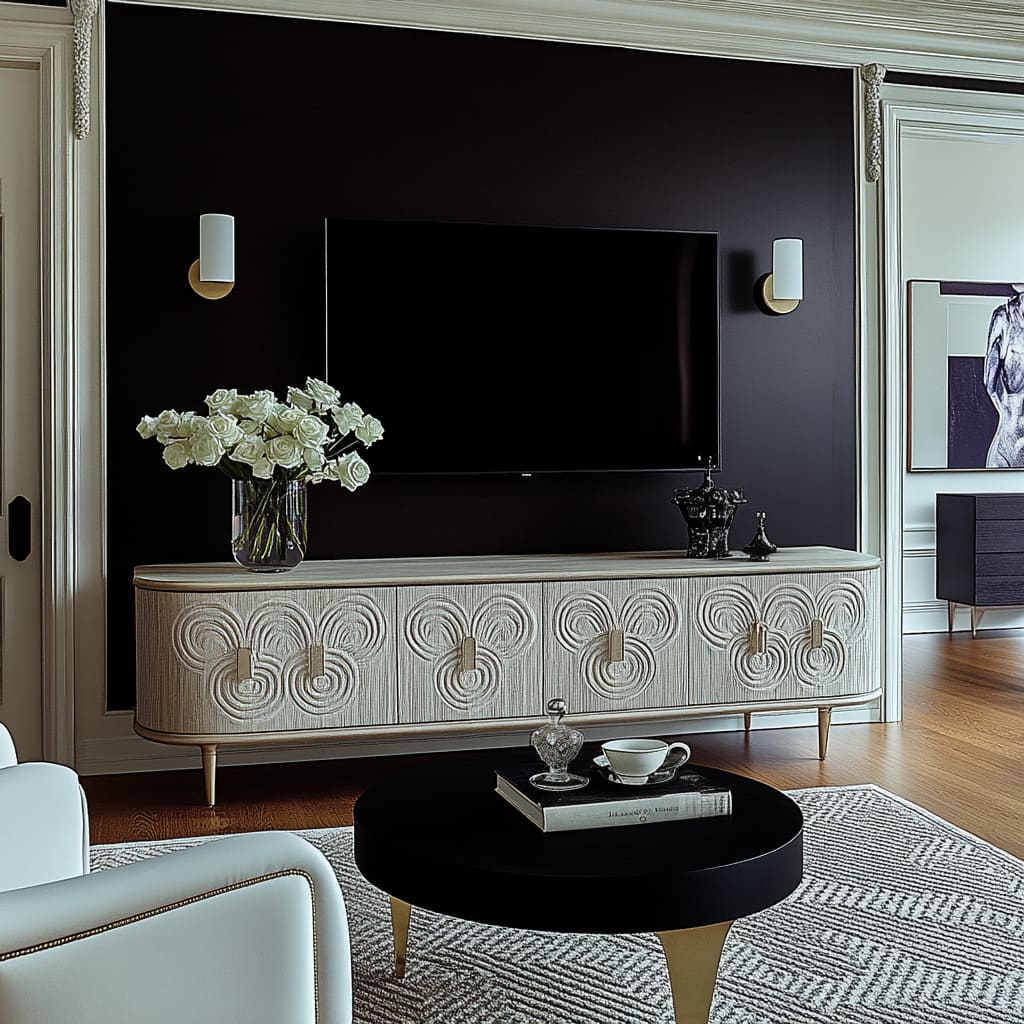 Finish plays a large role in how these surfaces feel. Matte black panels swallow light, making a TV almost disappear when it is off, while glossy objects in front—vases, glass pieces, small bowls—pick up reflections and bring life back into the scene.