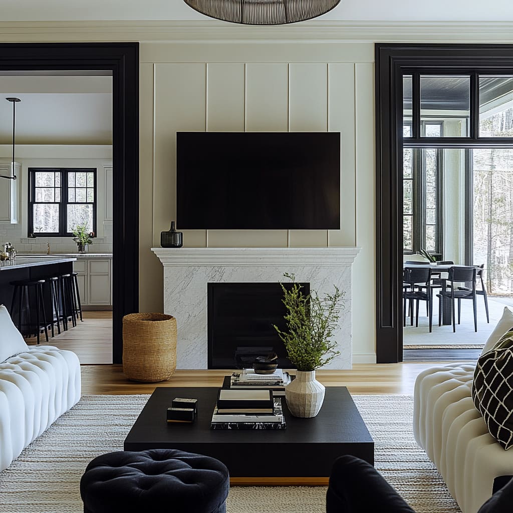 A striking feature of many schemes based on a simple black and white living room concept is how the panel logic continues into connected spaces. Doorways to kitchens or dining zones are often framed with bold black trims that echo the central panel wall, forming visual brackets that hold the living room in the middle.