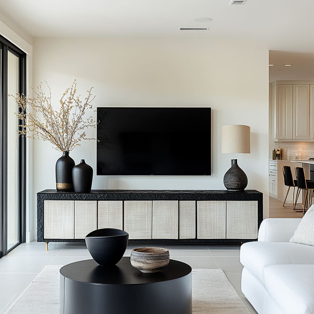 Because of this, black is often concentrated in a few zones—the panel inset, the coffee table, a long media console—rather than sprinkled everywhere. Where black does appear on movable items, it tends to be in compact, grounded forms: drum tables, cube tables, small ottomans, slim sideboards with vertical texture.
