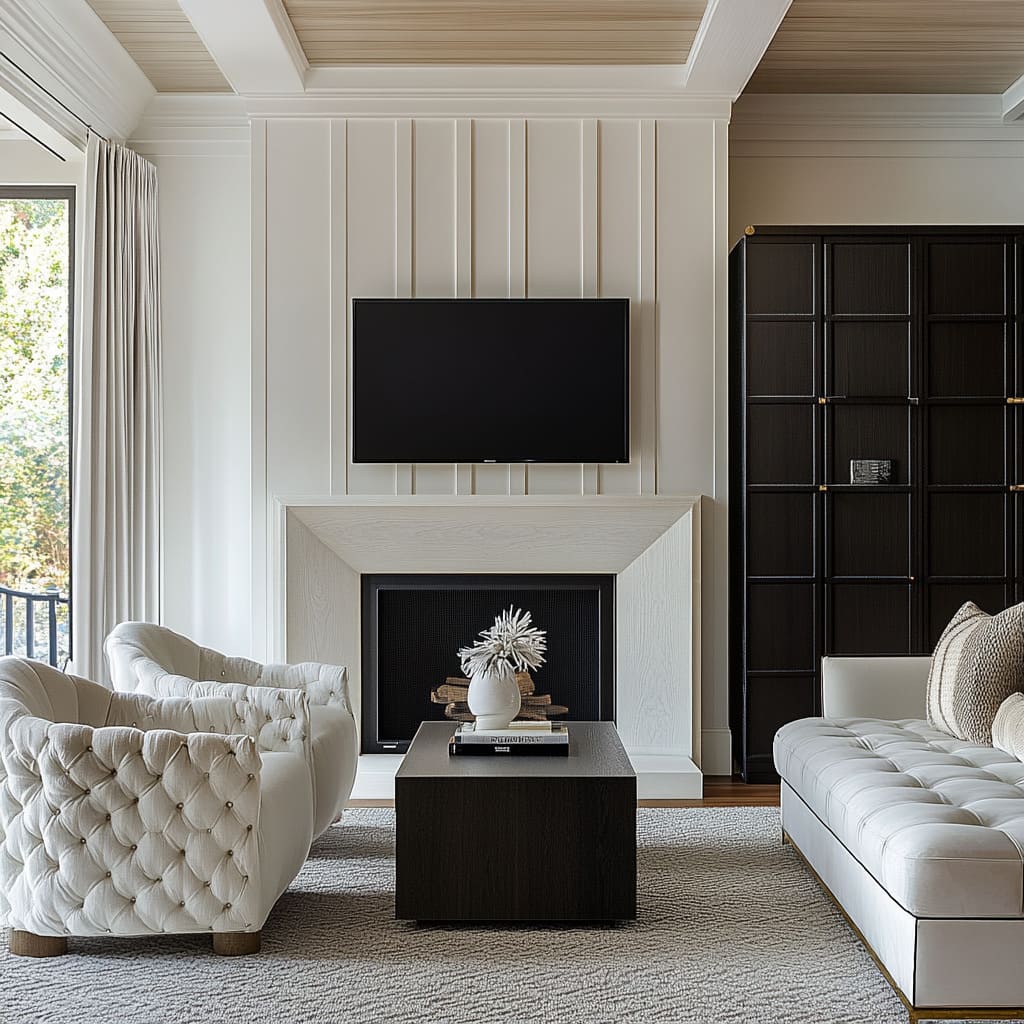 In many schemes based on simple black and white living room design, furniture is chosen less for style labels and more for how it talks to the panel background. When walls are strongly vertical, seating often repeats that rhythm through channel tufting or elongated cushion seams.