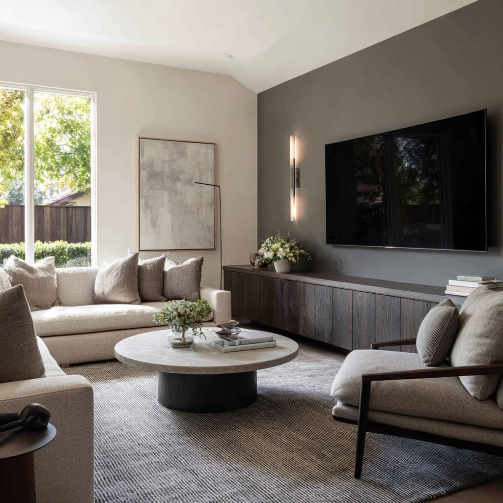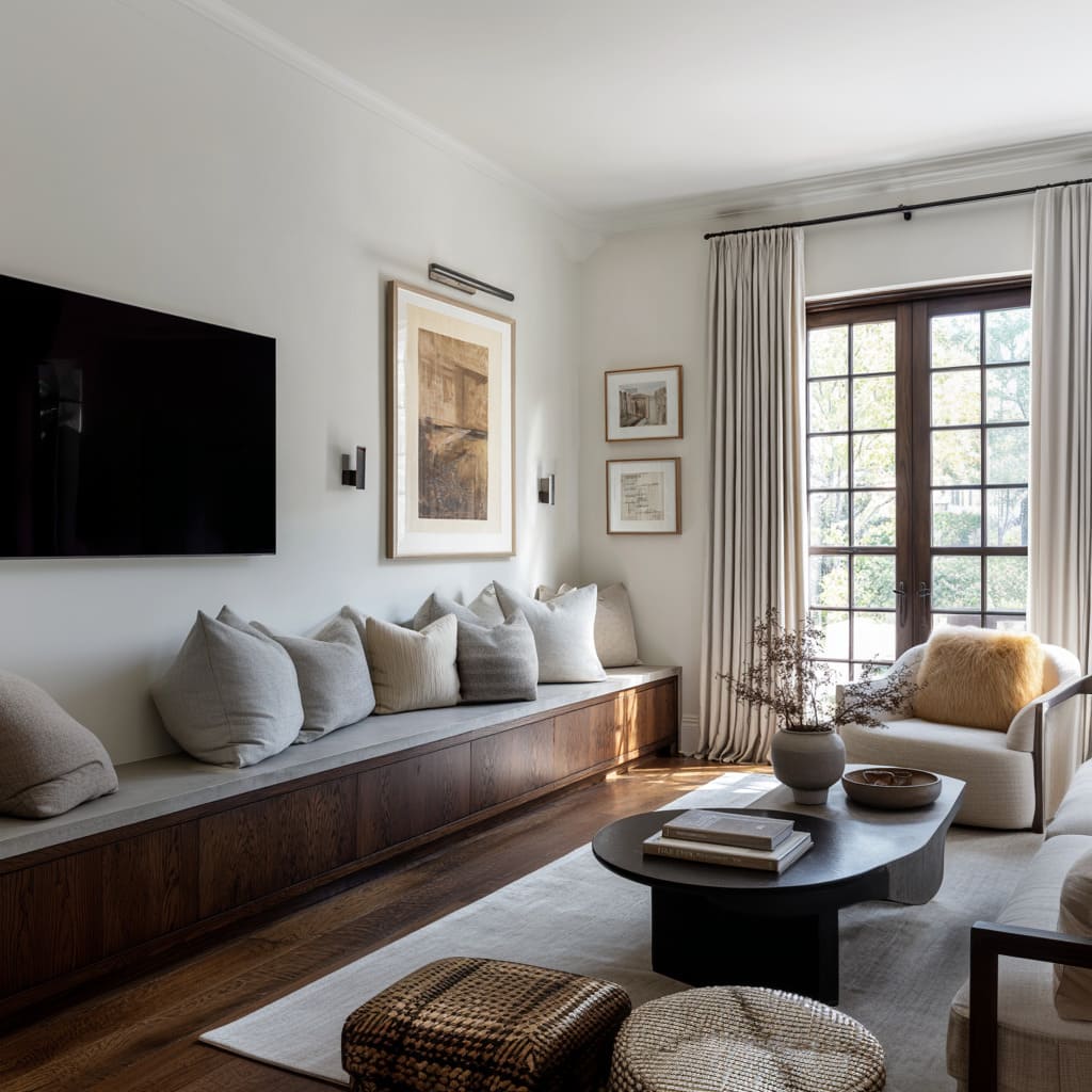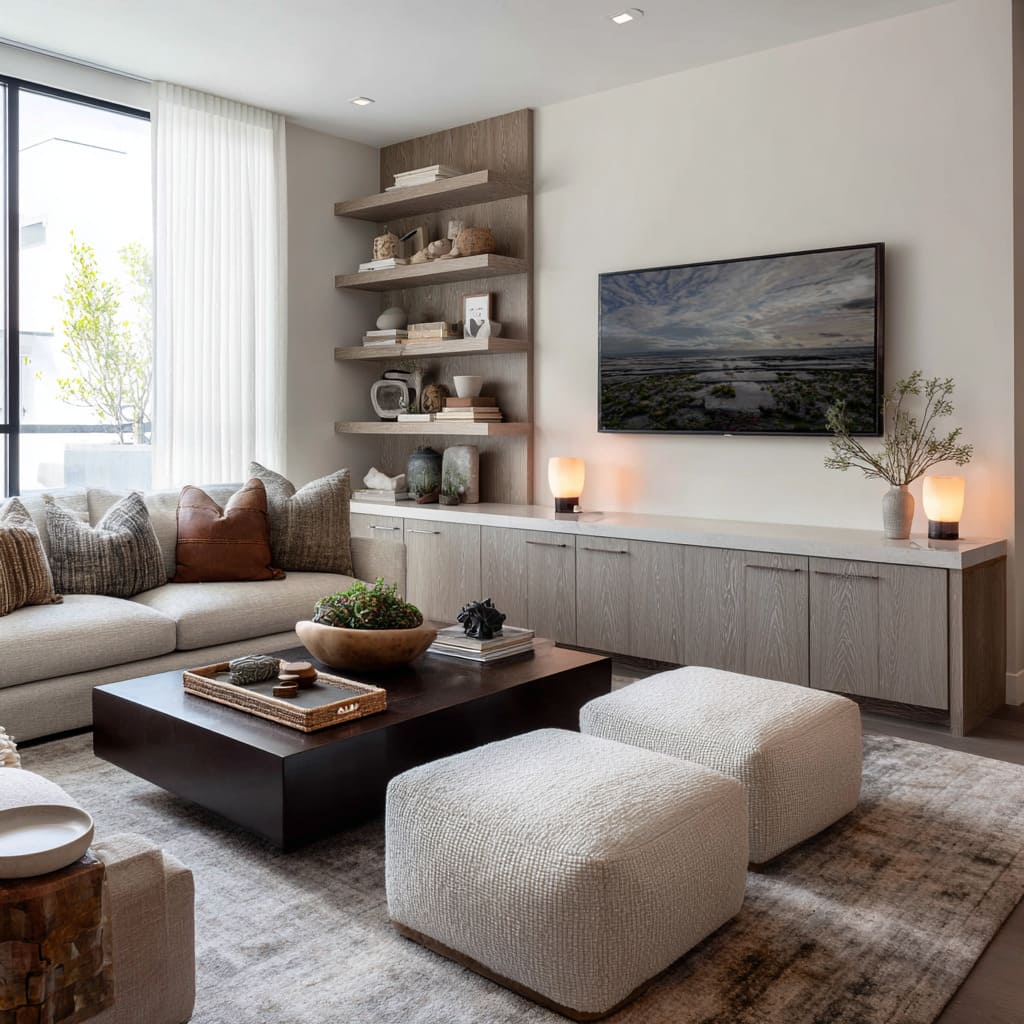 This is where small modern luxury living room designs get sophisticated: the fix isn’t hiding the TV. It’s giving the wall another reason to exist.