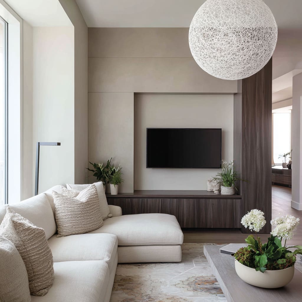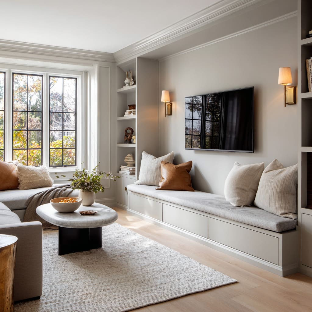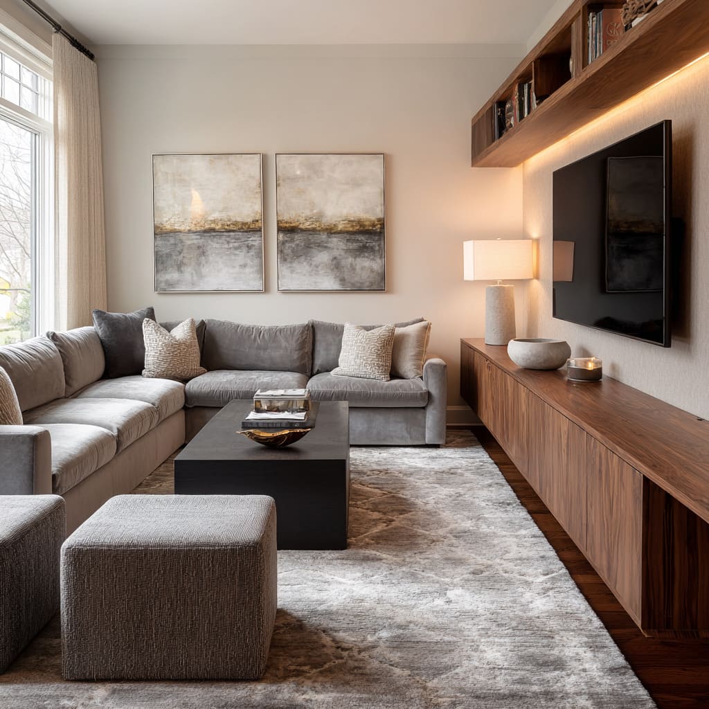 This is where small modern luxury living room designs get sophisticated: the fix isn’t hiding the TV. It’s giving the wall another reason to exist.
