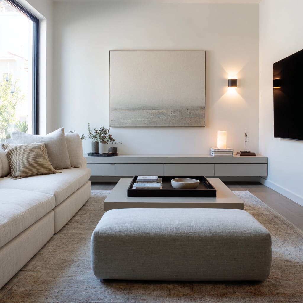 - One baseline that stabilizes the room (long low cabinet, bench, ledge)