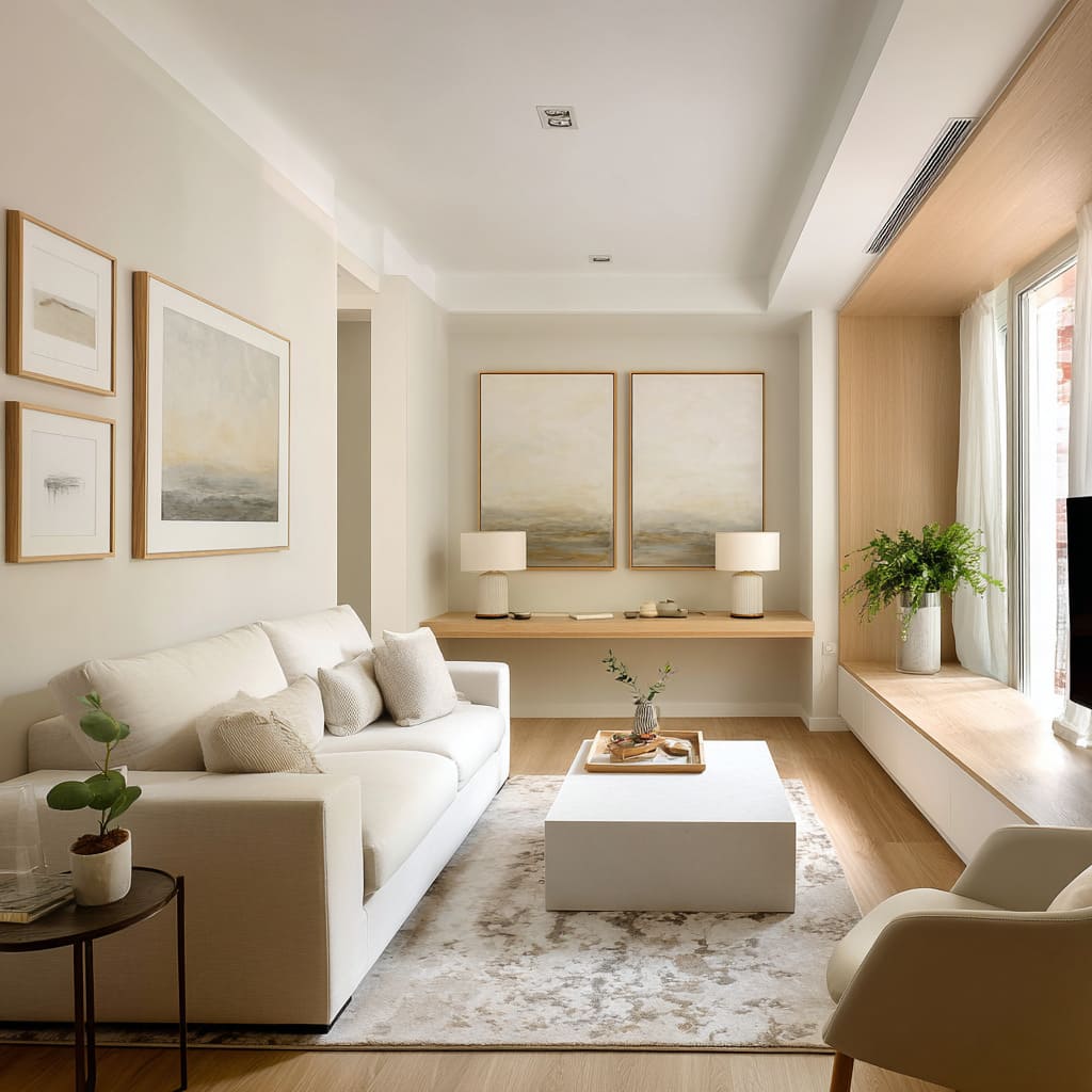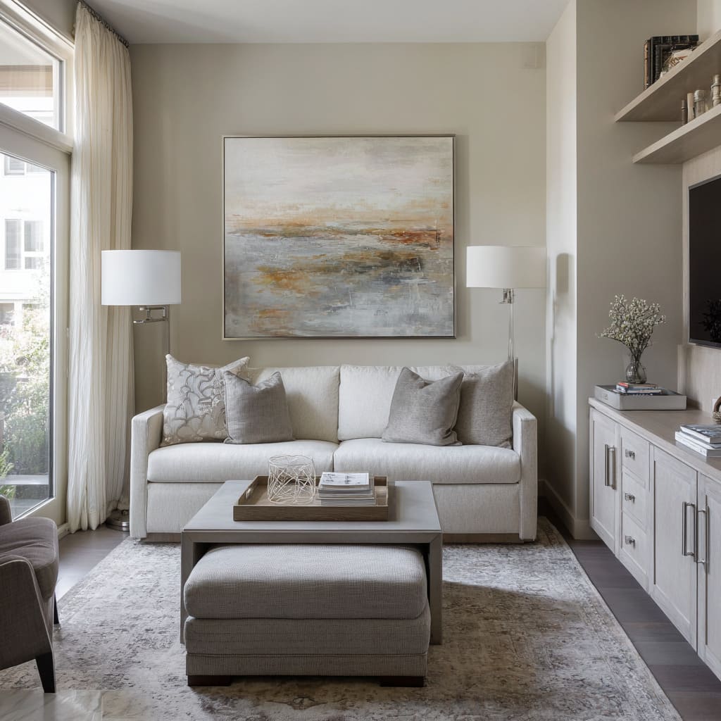 This is one of the most overlooked parts of luxury small living room design: the eye needs a steady line. For example, a pale top can run end-to-end like a calm horizon.