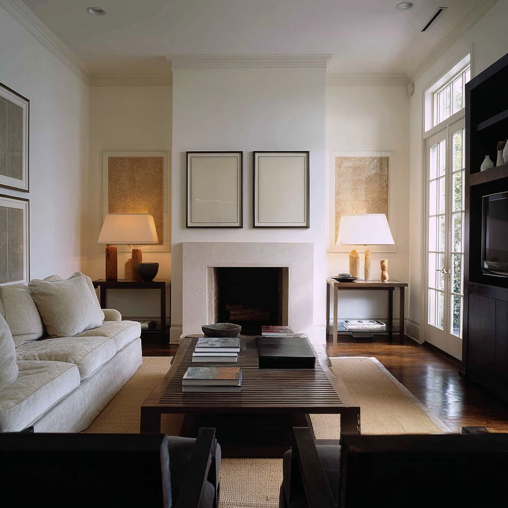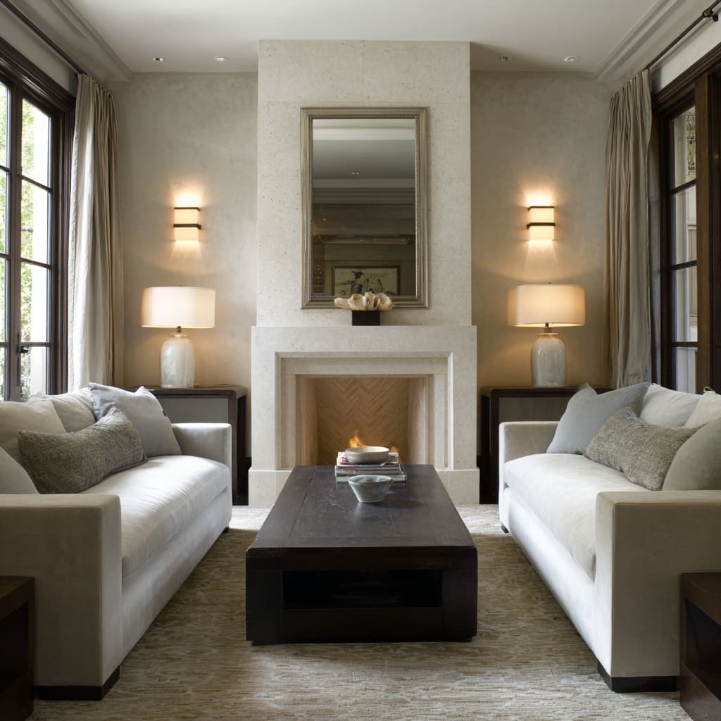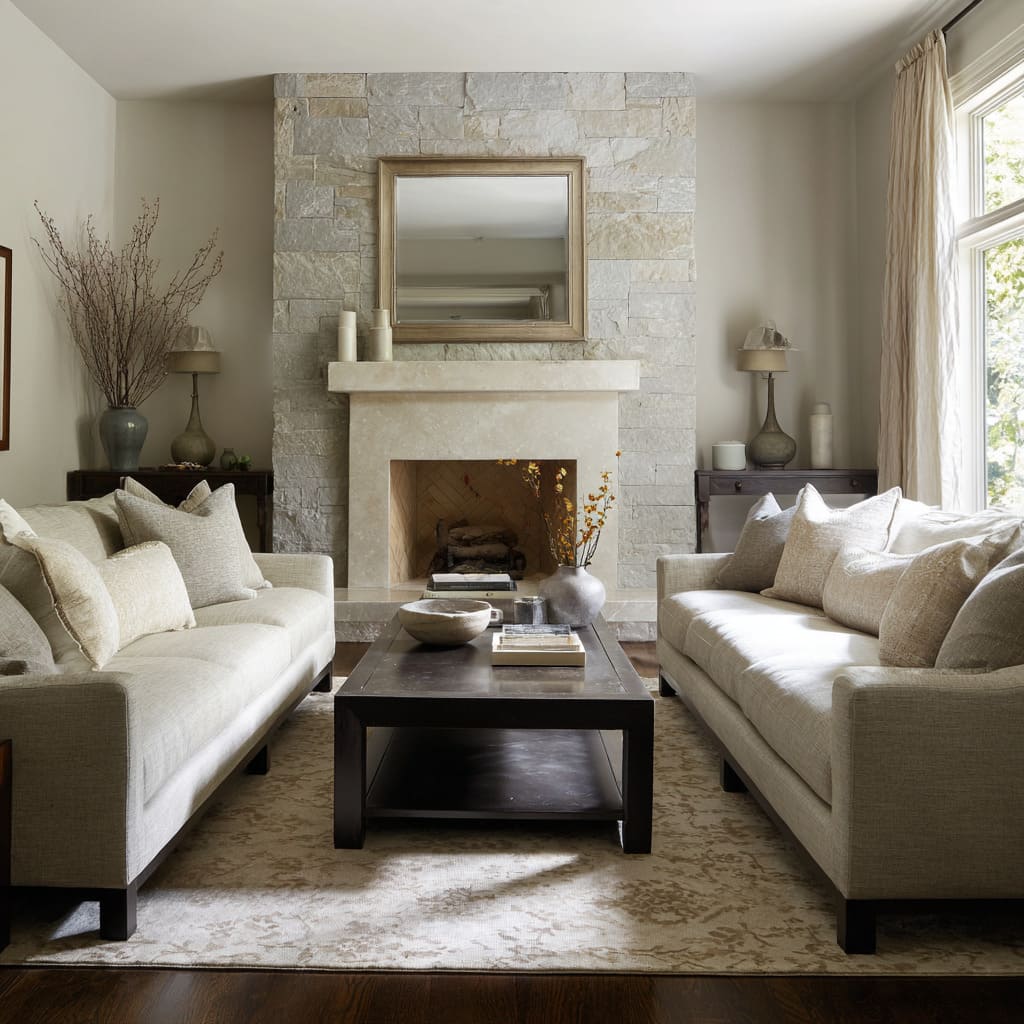 - Fireplace rooms can use balanced sofas, balanced lamps, and centered mirrors to signal maturity and stability.