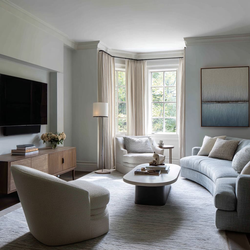 - Curved seating can reduce the “boxy” feeling that can make compact rooms feel strict.