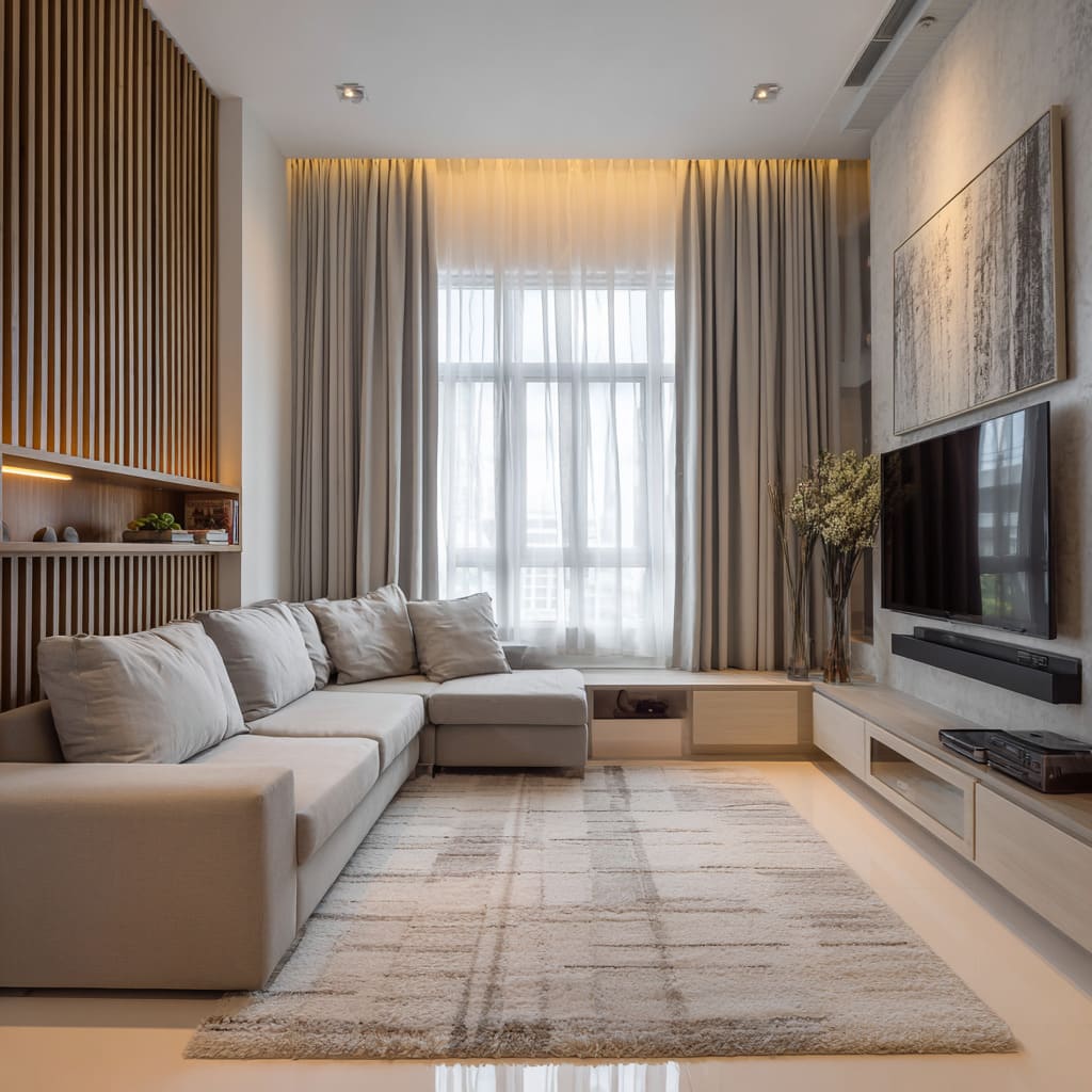 The rug is large and intentionally quiet. The deeper reason: in compact living room designs, the rug is the visual boundary that tells the brain, “this is one planned seating island.