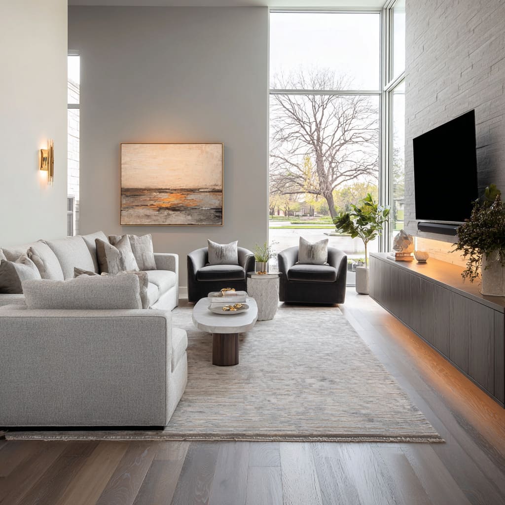 - Confident scale (oversized art, pairs, strong center table)