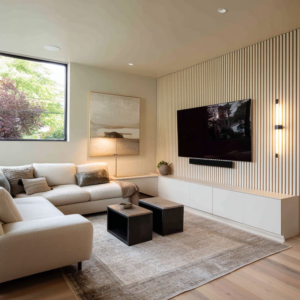 - In slat-wall ideas, the wall itself provides countless vertical lines, so the TV edge becomes one rectangle inside a field of rhythm.