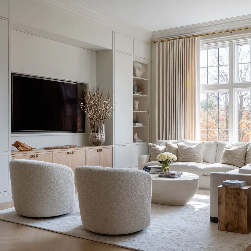 - The TV niche as an architectural edge, which lets open-plan space feel “zoned” without extra furniture.
