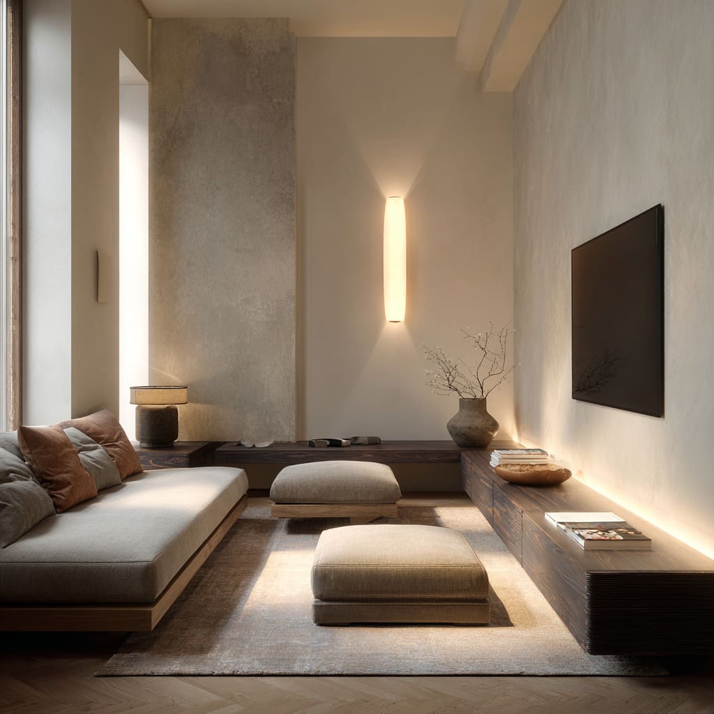 - Vertical wall glow: sconces create tall light columns that stretch the wall and soften the TV contrast.