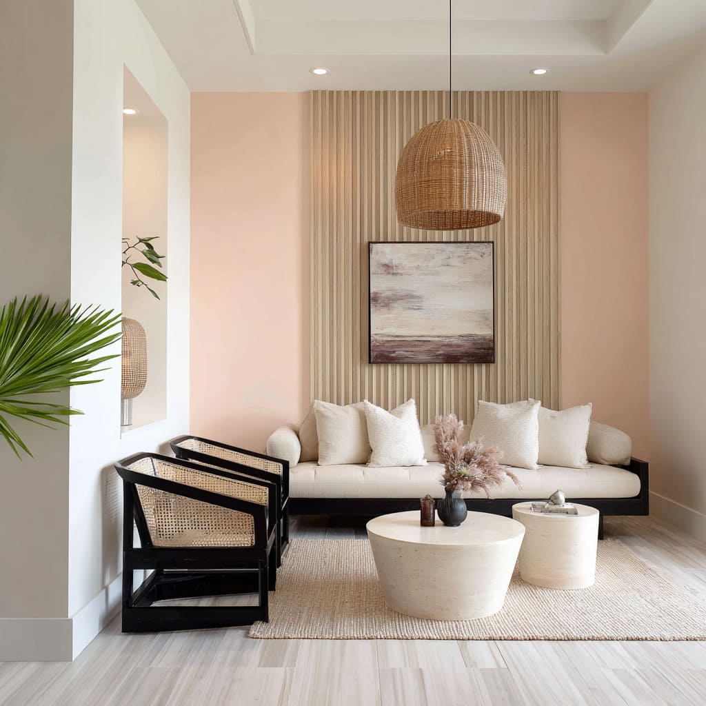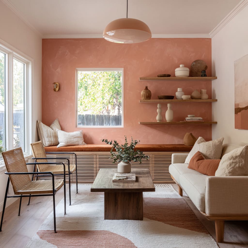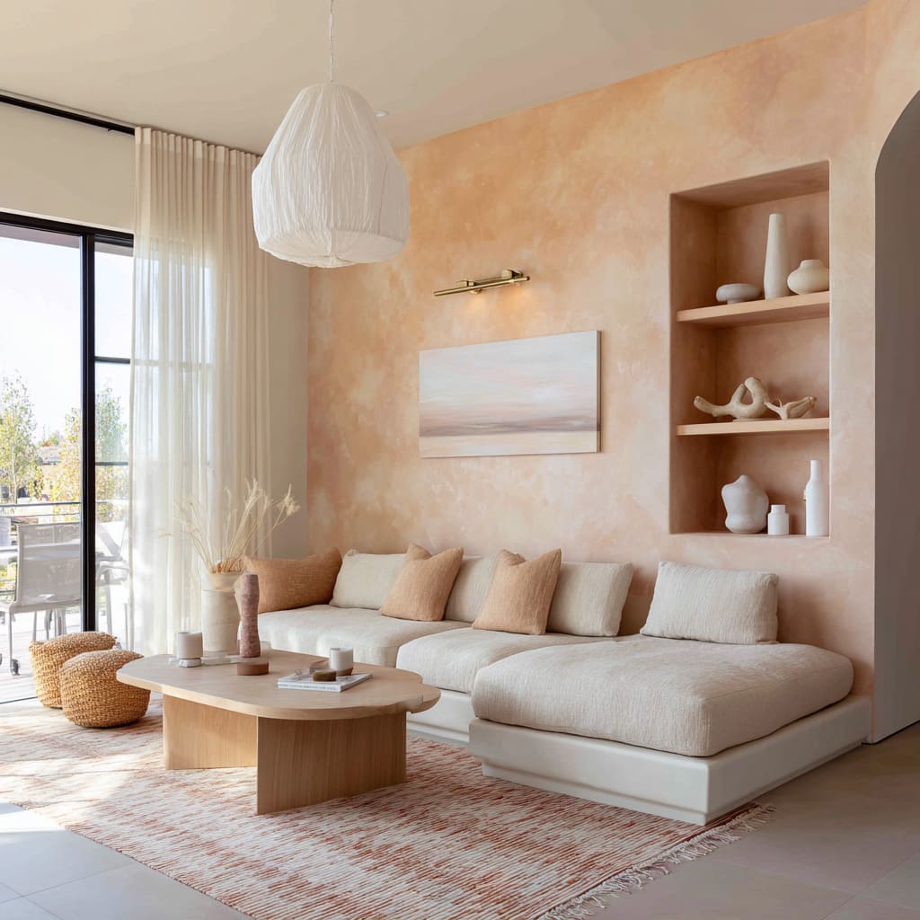 In rooms with sheer curtains or soft pendant light, a peach-toned plaster can even catch glow in the corners, giving the whole surface a slow-lit feel.