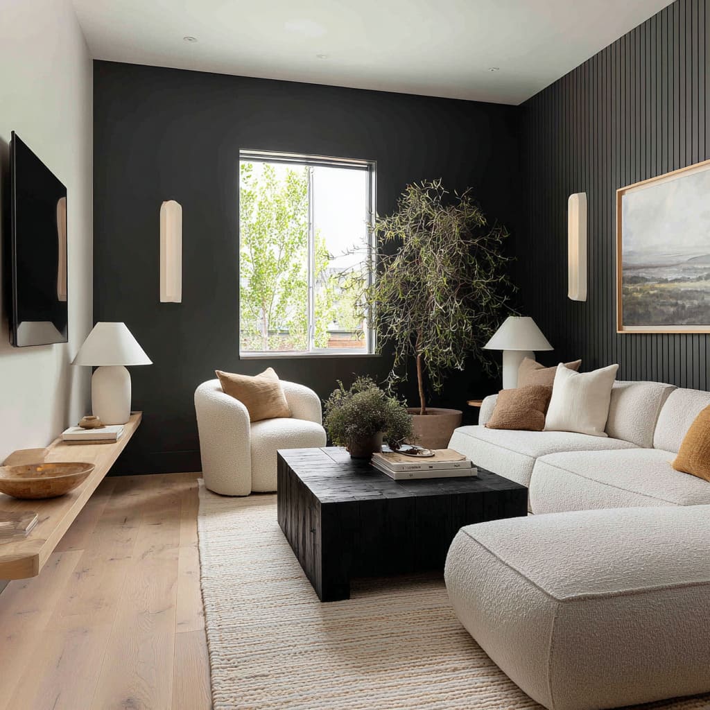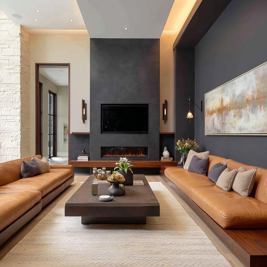 What keeps these deep tones from feeling severe is the presence of subtle contrasts that gently counterbalance their density. Think pale oak or walnut ledges running across the lower third, or a slab-style coffee table that picks up just enough natural grain to soften the vertical expanse.