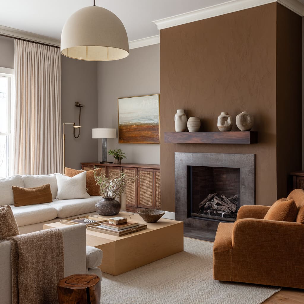 A smooth chocolate wall with cooler undertones can sit behind rust-colored accents and cream upholstery without shifting the overall mood. The wall stays grounded, but its subtle tint picks up cues from the furniture and textiles, creating a low-key rhythm across surfaces.