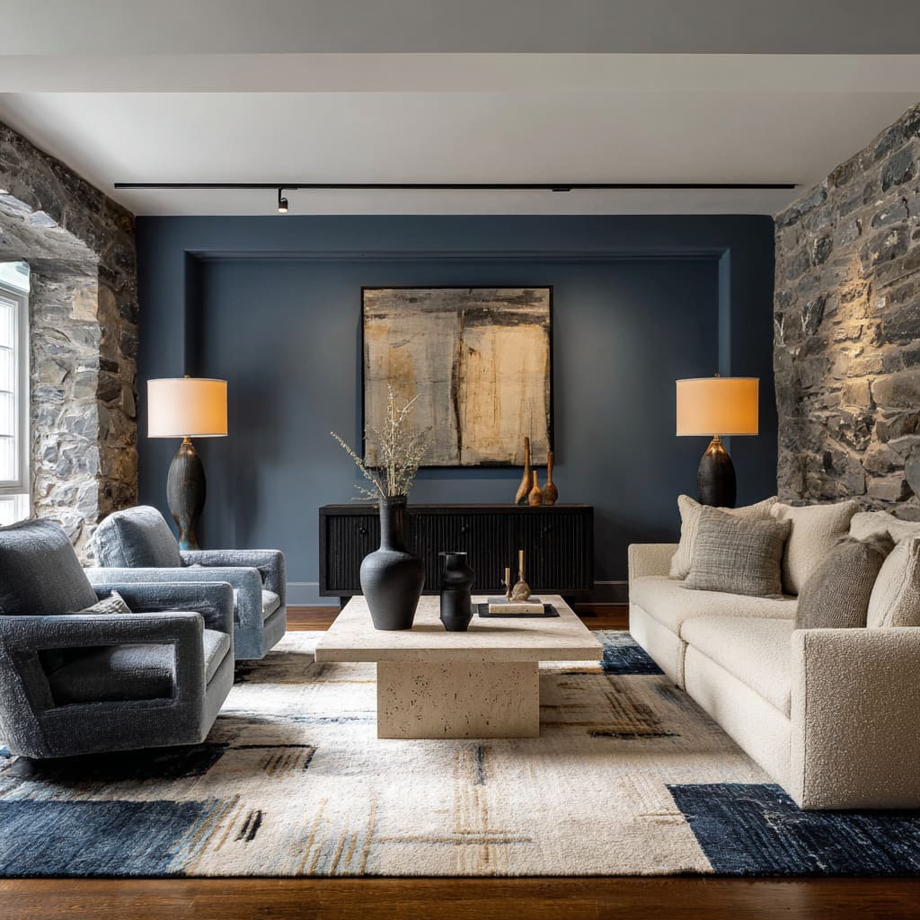 In rooms where stone textures sit nearby, like pale limestone or sandstone, the absorption quality of dark blue makes surrounding materials appear sharper and more dimensional, even with no change in lighting. It’s not about brightness—it’s about contrast handled with care.