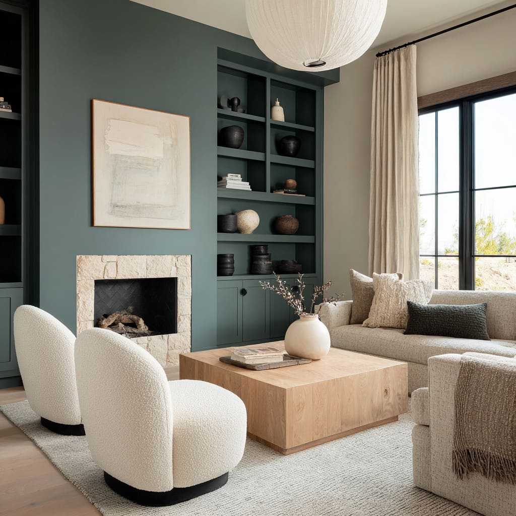 These kinds of treatments are among the more unexpected living room accent wall paint ideas, not because they shout, but because they’re used as color architecture—giving form and enclosure to the bolder pigments that typically feel loud elsewhere. With soft finishes and close placement, the wall becomes a solid, grounded element within the space.