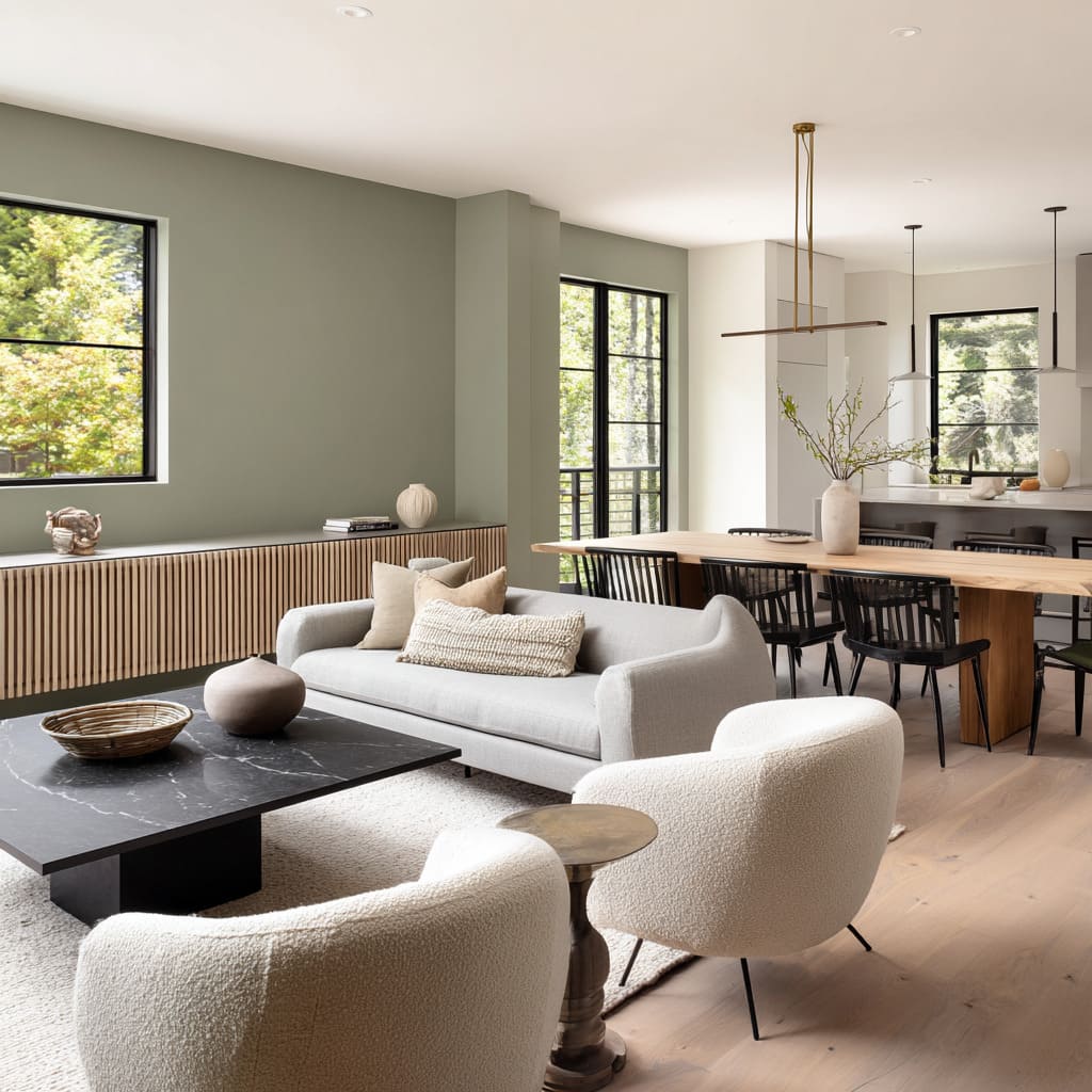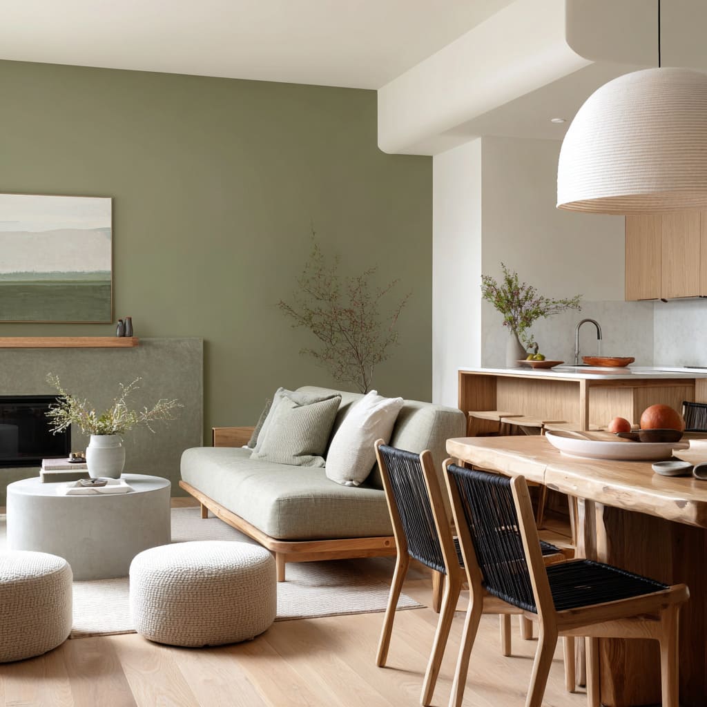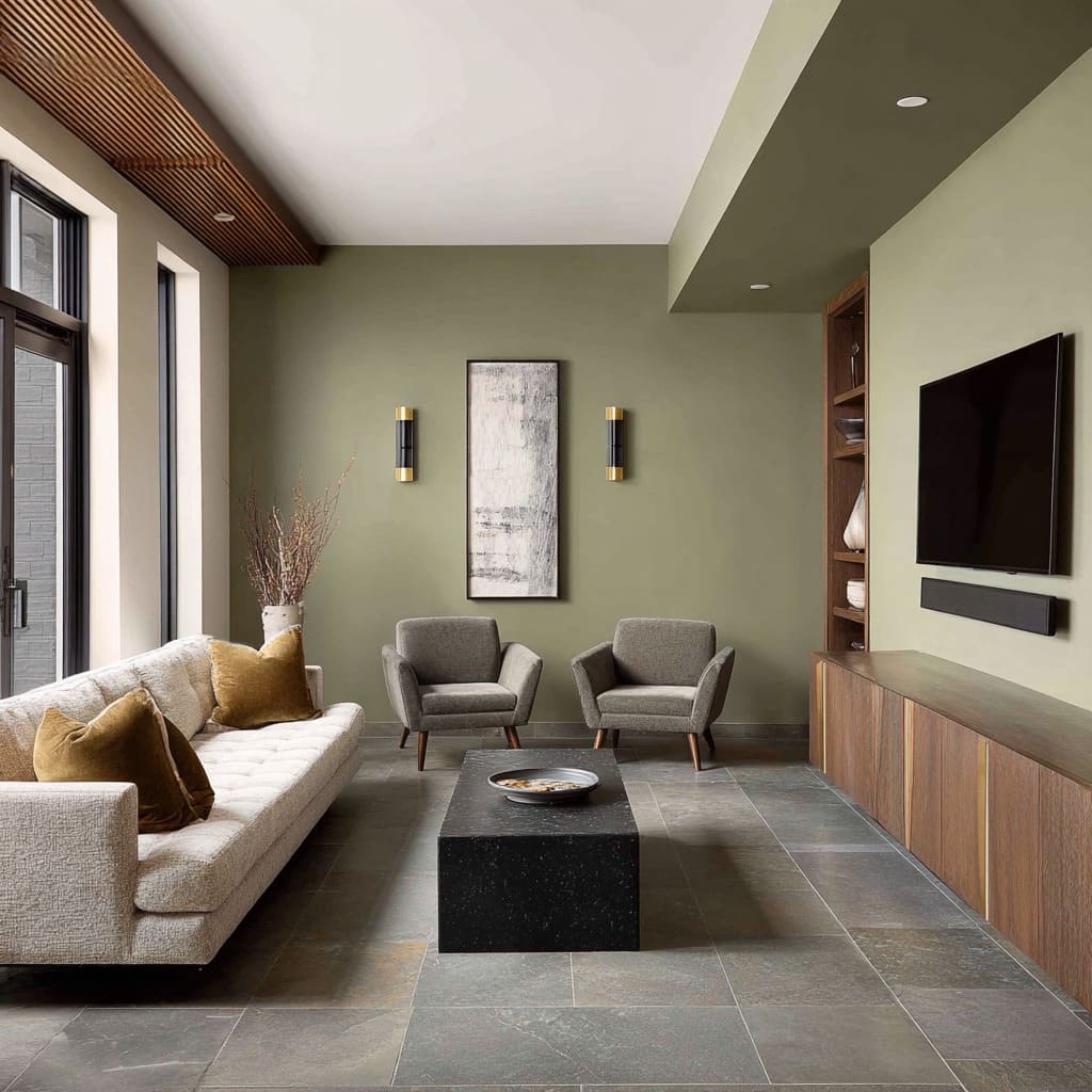 There’s a quiet trick to using green without making the room feel themed or seasonal: steer it toward gray. Dusty olive, eucalyptus, and muted juniper shades avoid brightness by pulling from stone tones rather than leafy ones.