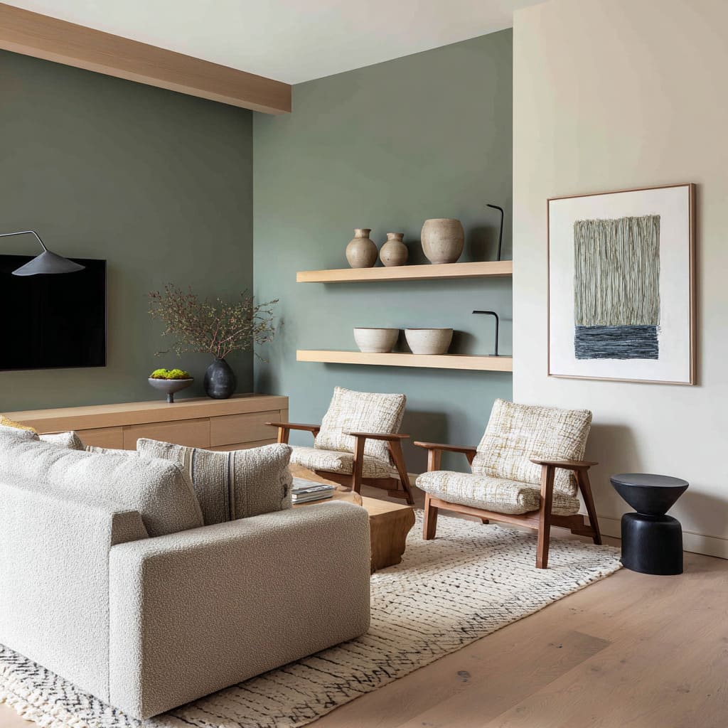 What makes these shades valuable in many accent wall designs with paint is their adaptability. While bright colors tend to dictate everything around them, these moody low-chroma tones allow other materials—wood grain, soft metal, textured fabric—to show up more fully.