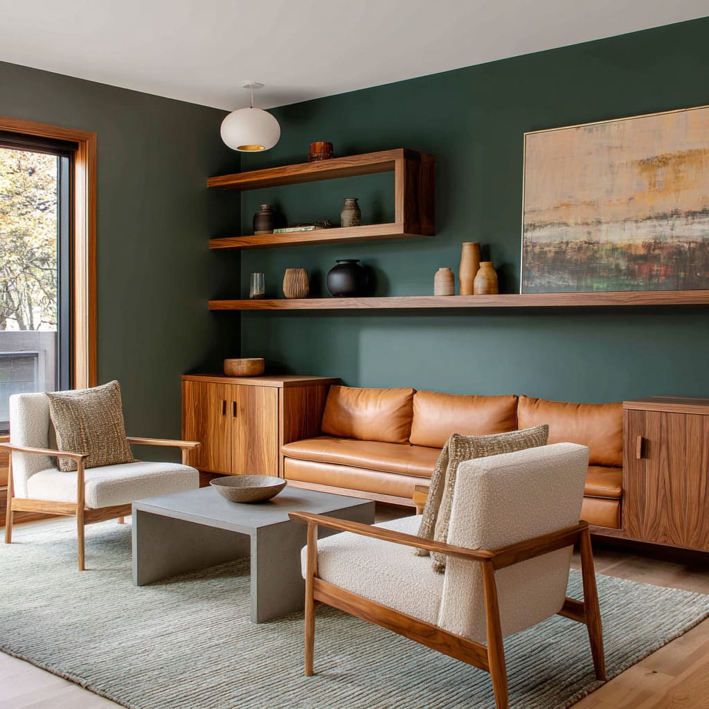 In some living areas, a deeper forest tone can act like a shaded tree line. Framing this kind of green with walnut or medium oak shelves introduces a subtle vertical rhythm, evoking a natural structure.