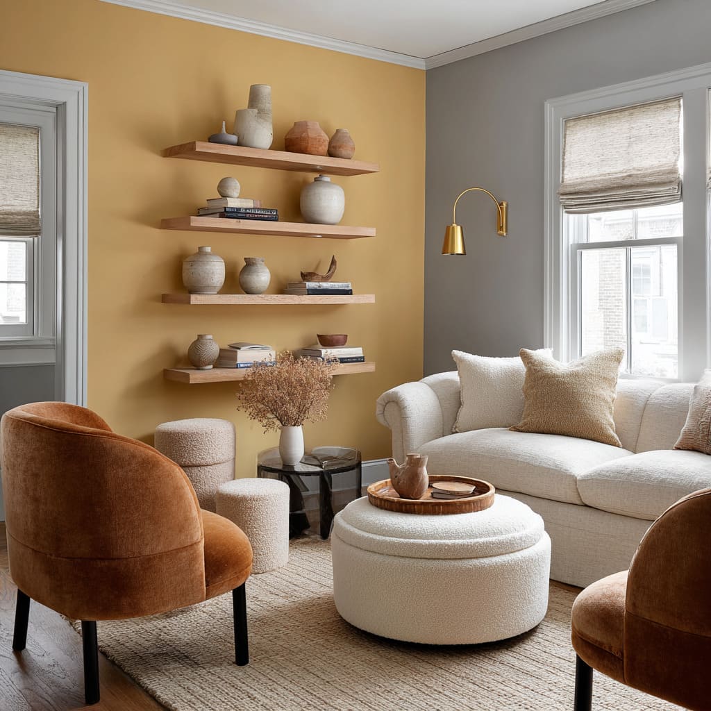 Instead of pairing with pure yellows—which can flatten the mood—these tones are best flanked by camel, clay, and rust, which sit nearby on the color wheel without competing. The supporting cast stays in the background: blond oak side tables, open shelving, and pale flooring that lets the wall do the lifting.