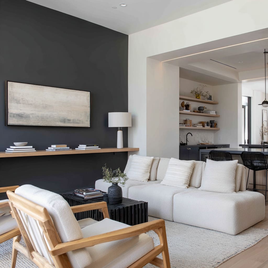 The result: a layout that feels still, deliberate, and structured without feeling forced. Among the more compelling accent walls ideas, this quiet, immersive use of charcoal proves how color can lead a room without dominating it.