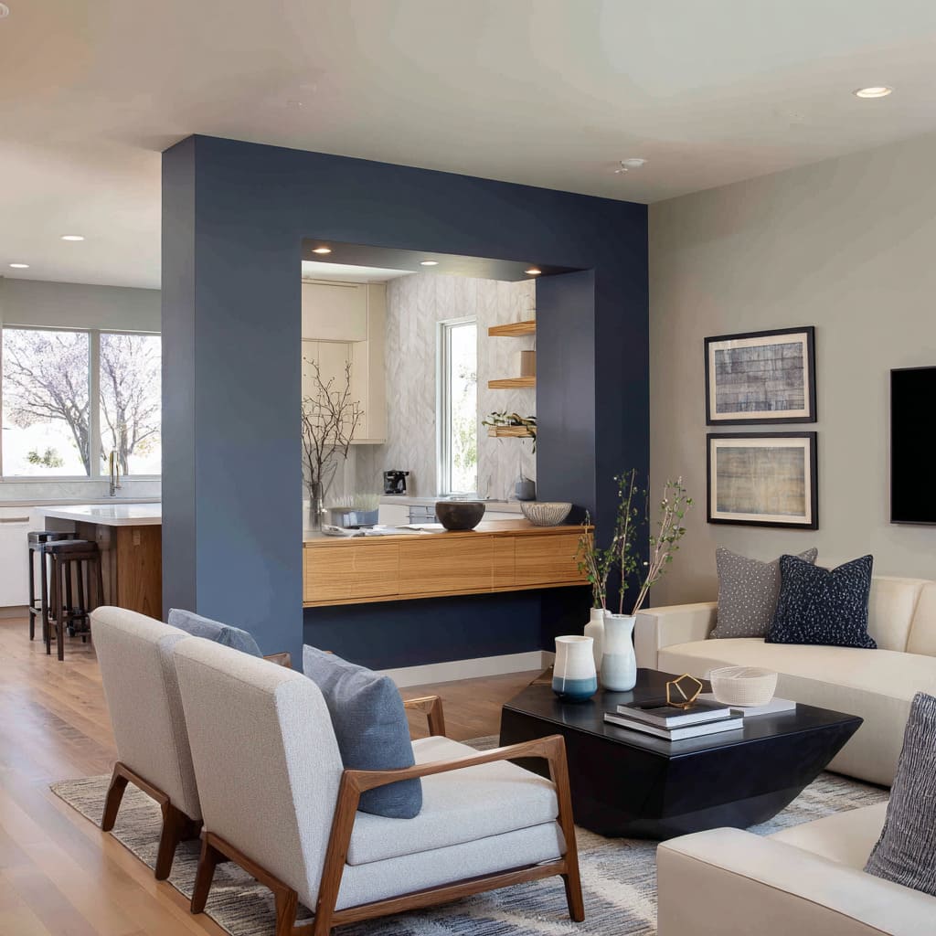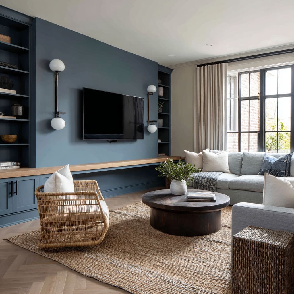 Among current accent wall paint ideas, this use of blue doesn’t shout—it outlines, deepens, and quiets the room by changing how walls hold space.