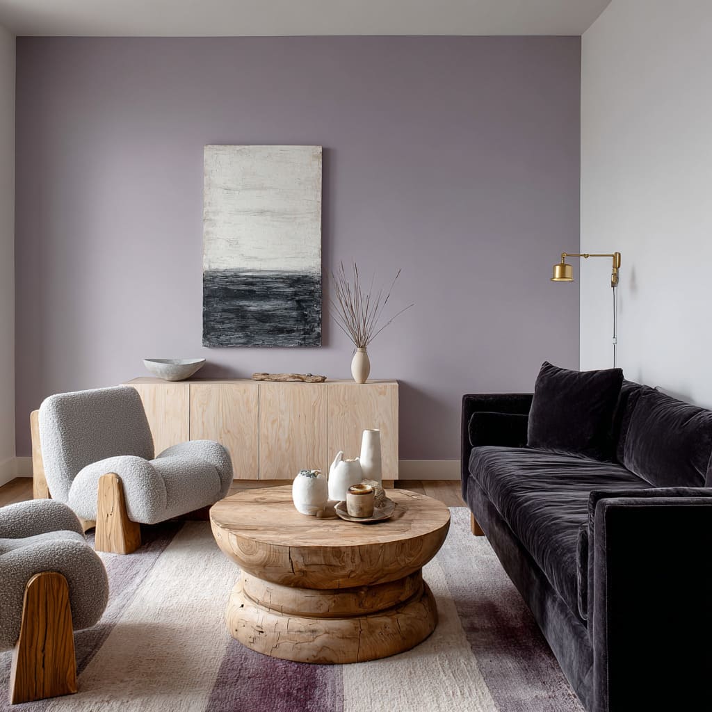 Even cooler shades like lavender-gray can add softness without retreating into pastel. Used on a backdrop for heavy or dark-toned furniture, this kind of dusty blue reads more like a shadow layer, giving large pieces a sculptural presence without needing contrast.