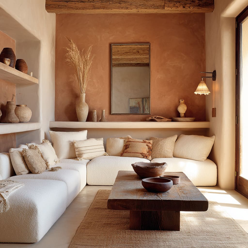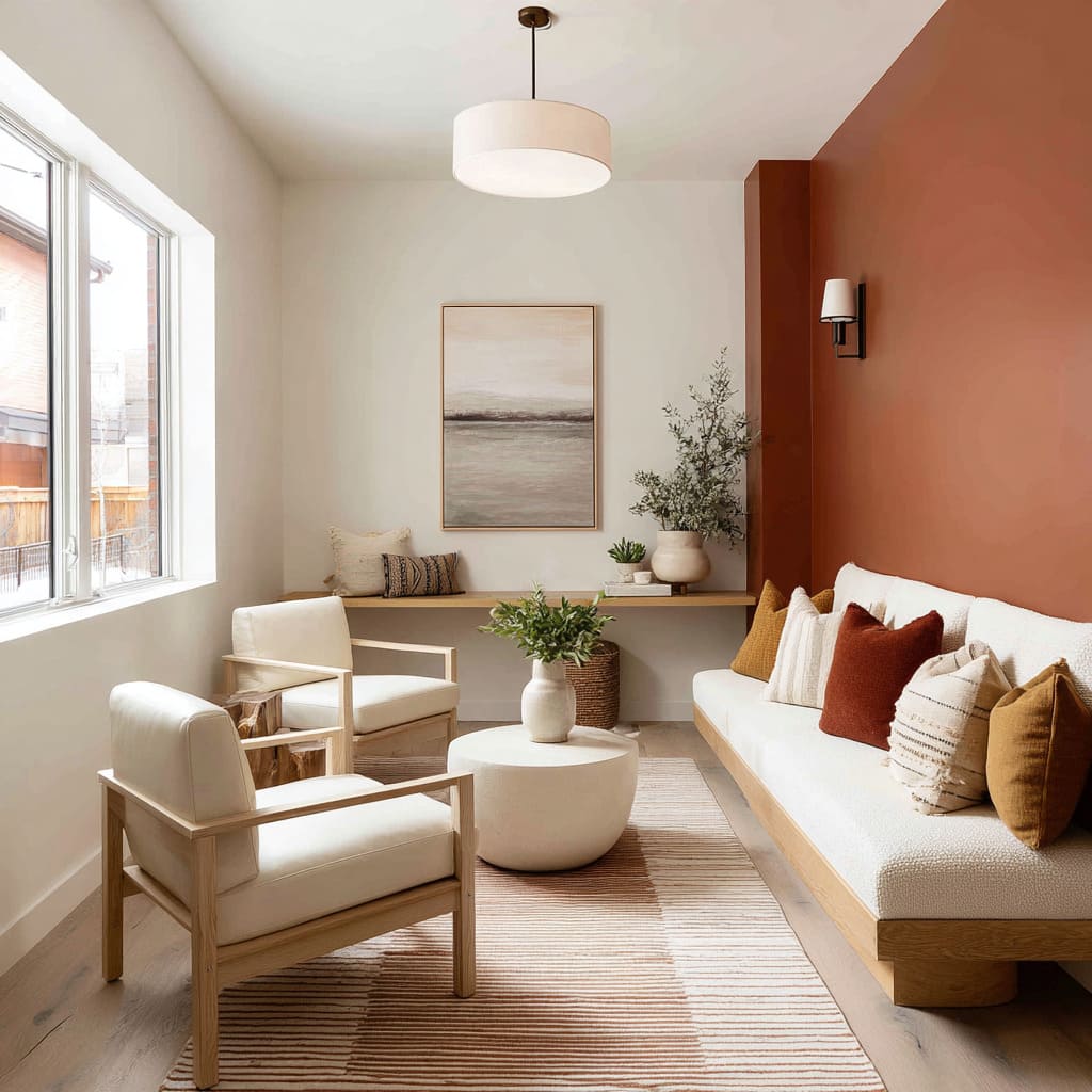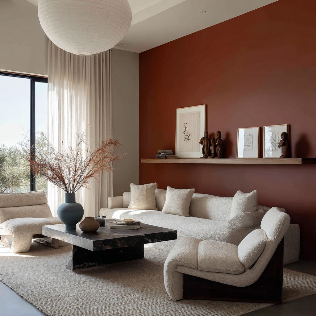 What sets these earth shades apart is how they interact with their surroundings. Paired with ivory or oatmeal-toned seating, rather than stark white, these walls build a soft warmth without breaking the visual temperature.