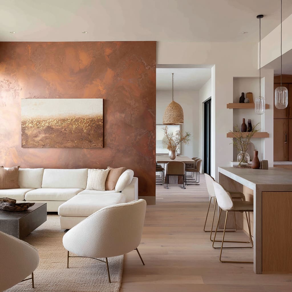 Some finishes go even further. Venetian plaster, oxidized metal, or layered washes in coppery tones shift slightly as light moves across them.