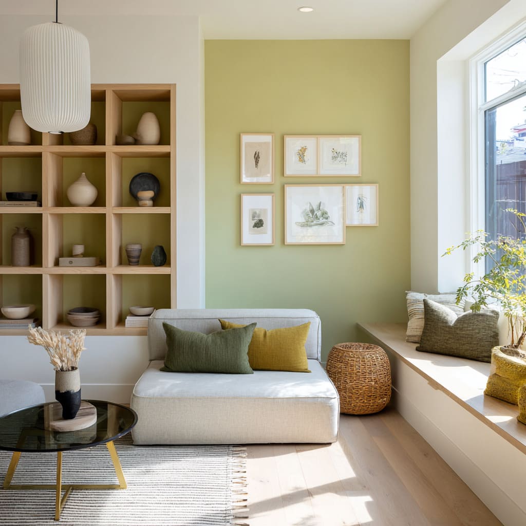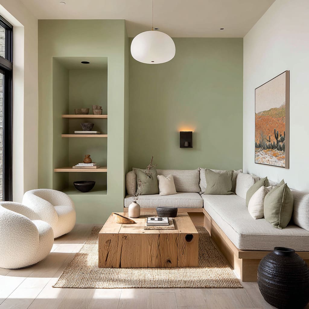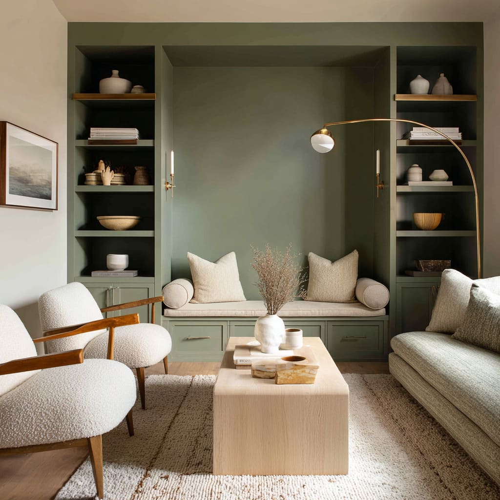These greens act almost like soft putty tones, but they carry more personality. Used in alcoves or built-ins, they wrap into corners and across depth changes to visually carve out space, making architectural features feel more dimensional.