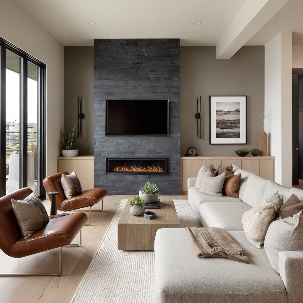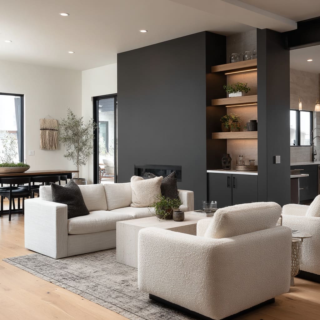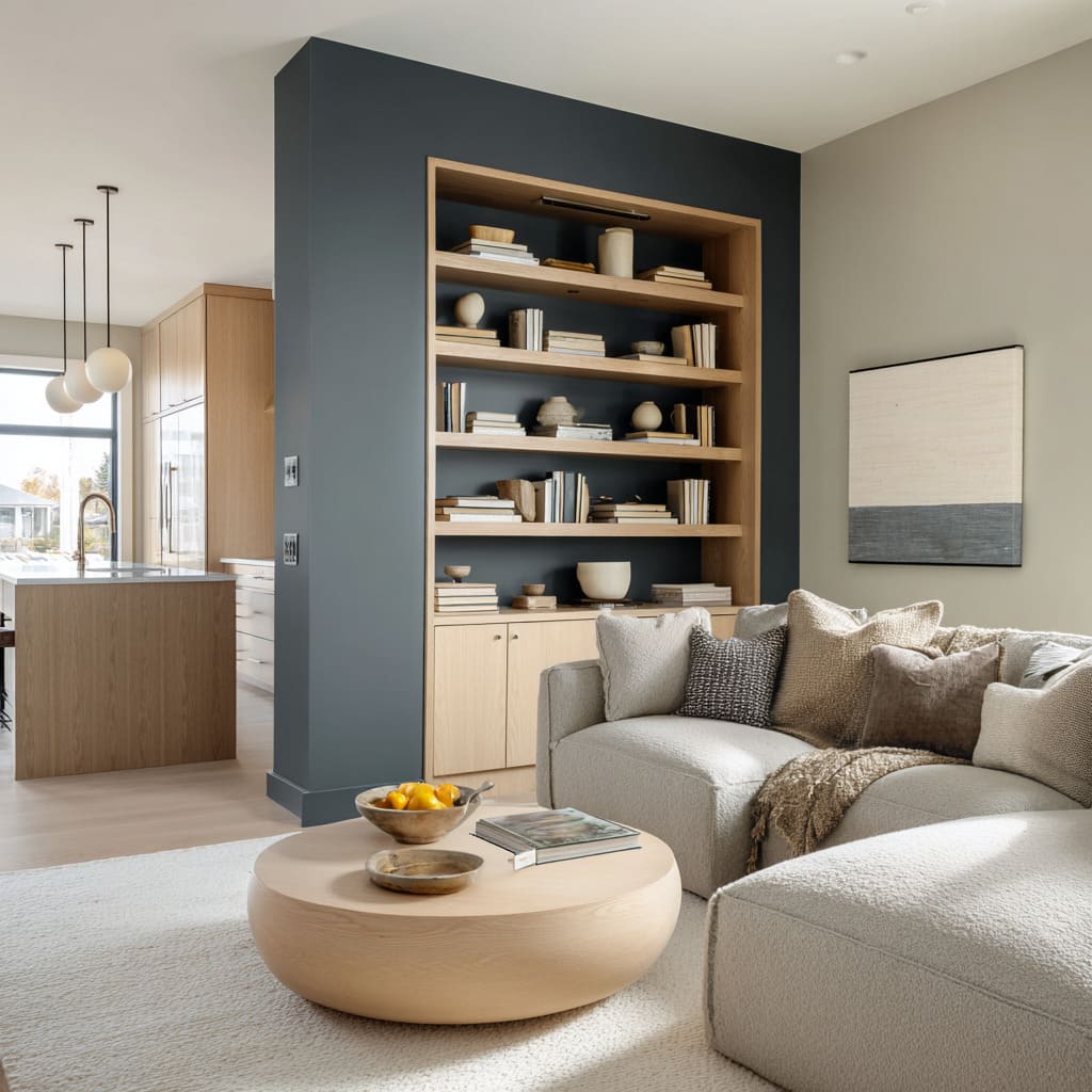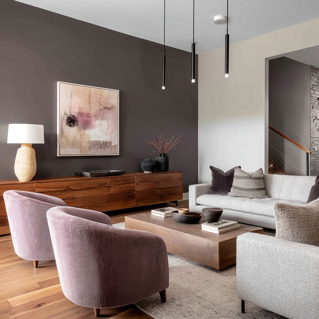 This surface quality has an almost tactile depth, especially in spaces where color carries a hint of graphite, slate, or warm ash. What’s surprising is how easily this tone shifts under changing daylight—cooler at midday, warmer by evening—making it one of the most adaptive choices in current living room accent wall ideas.