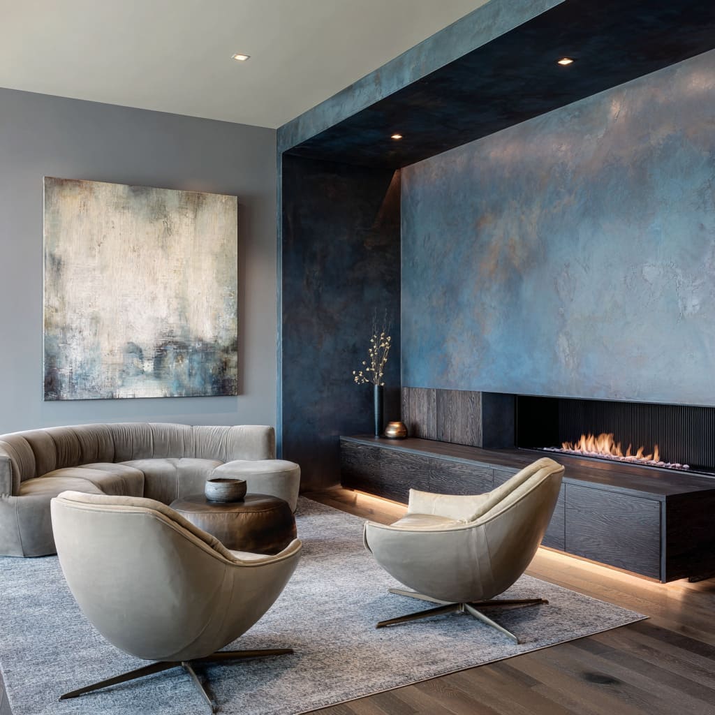 When a wall is treated with a multi-layered oxidized plaster that mixes smoke, charcoal, and dark teal tones, the result is movement—not pattern, but slow tonal shifts that mimic the surface of water or sky.