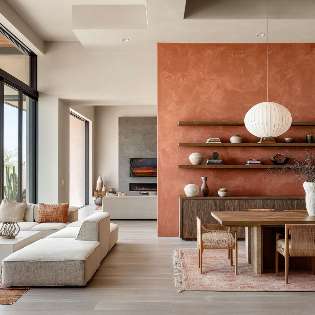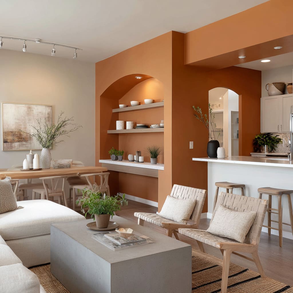 Certain saturated colors—pumpkin orange, paprika, muted blush—need structure to settle in. The most effective way to use these deeper hues is to contain them fully: inside an alcove, around an arch, or on a defined surface that wraps inward.
