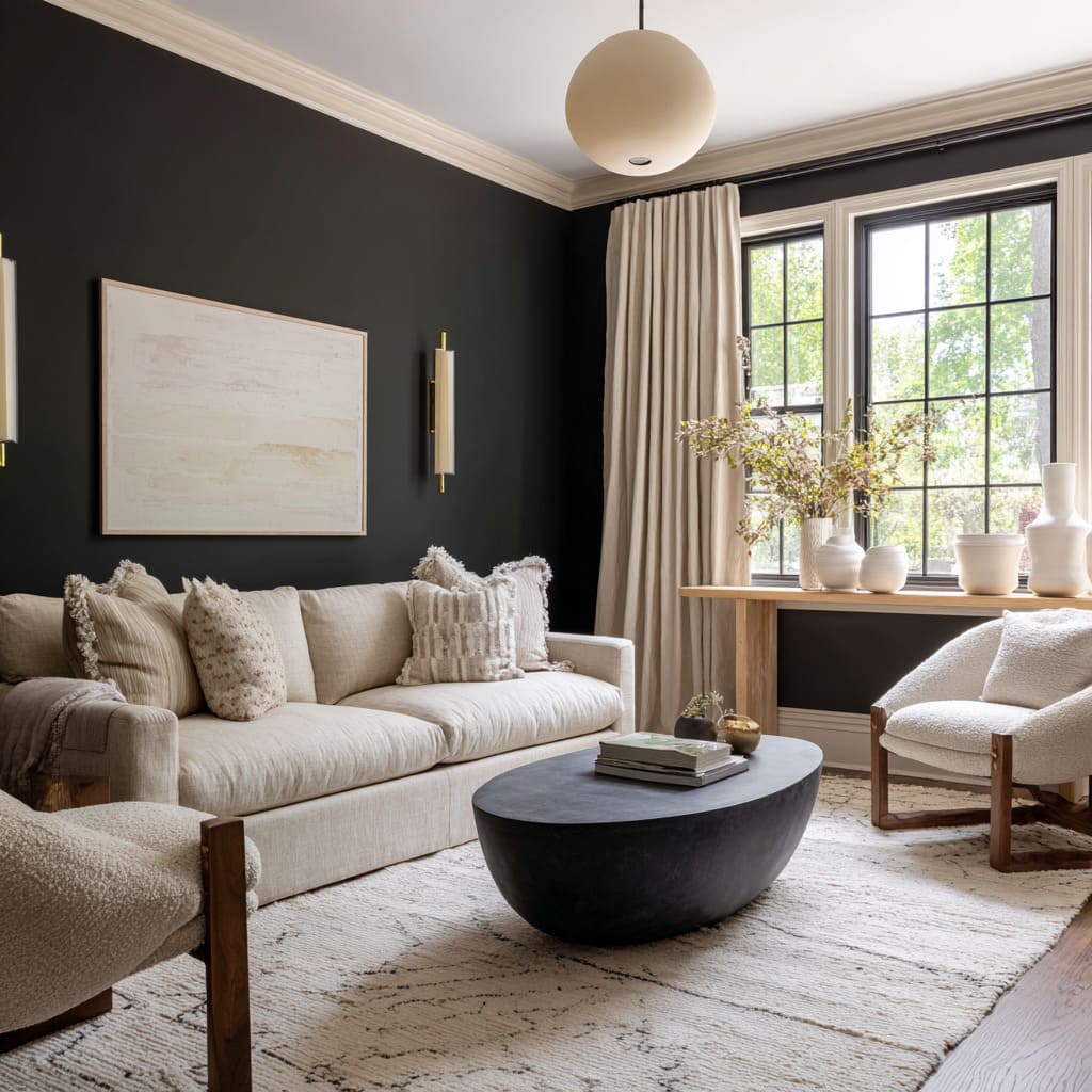 Caramel leather, off-white boucle, and layered beige fabrics help the furnishings appear brighter without exaggerating the contrast. These combinations allow the charcoal to sit back visually, almost like negative space that makes everything else stand clearer.