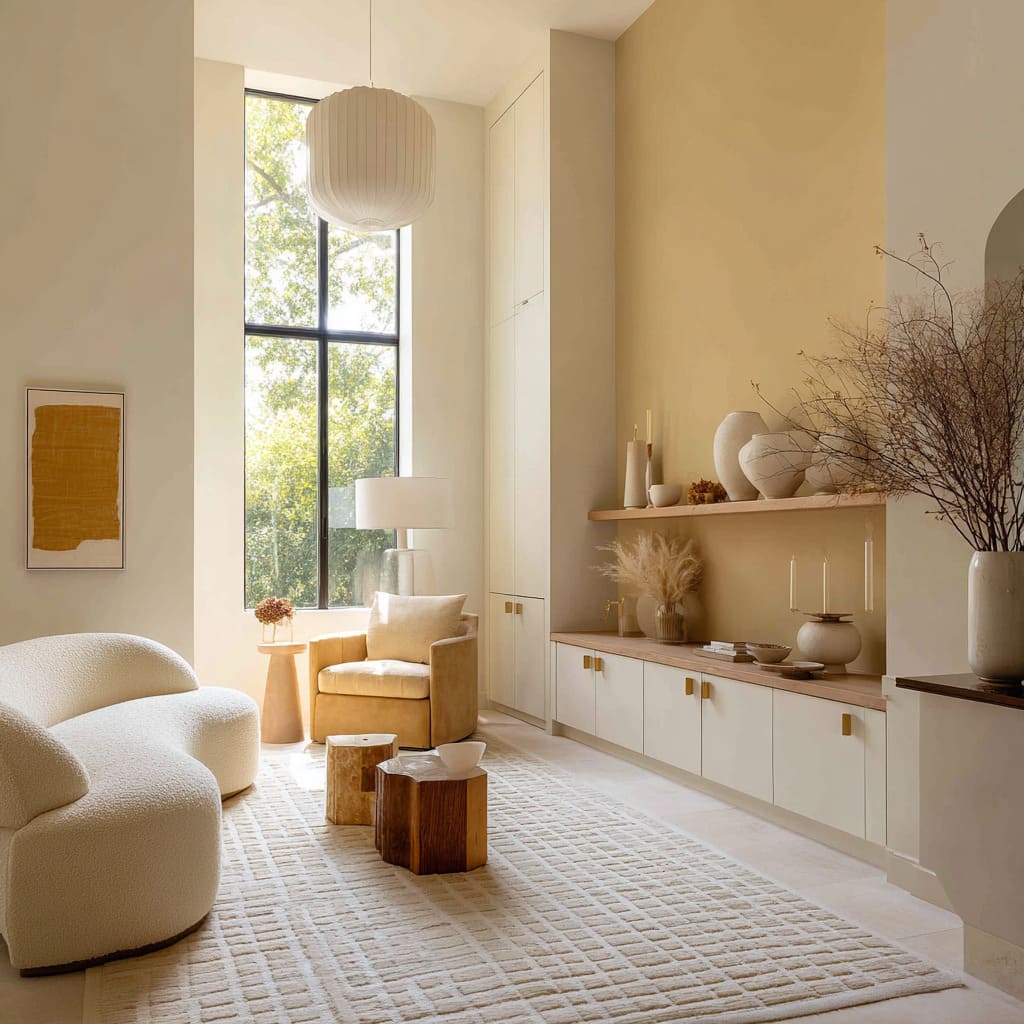 In tall, clean-lined spaces, soft ochre tones help bounce natural light up pale surfaces, like ivory cabinetry or ceiling trim, which has the hidden effect of making vertical lines feel longer. That illusion matters—it stretches the room’s feeling without any change in height.