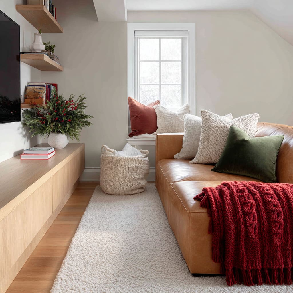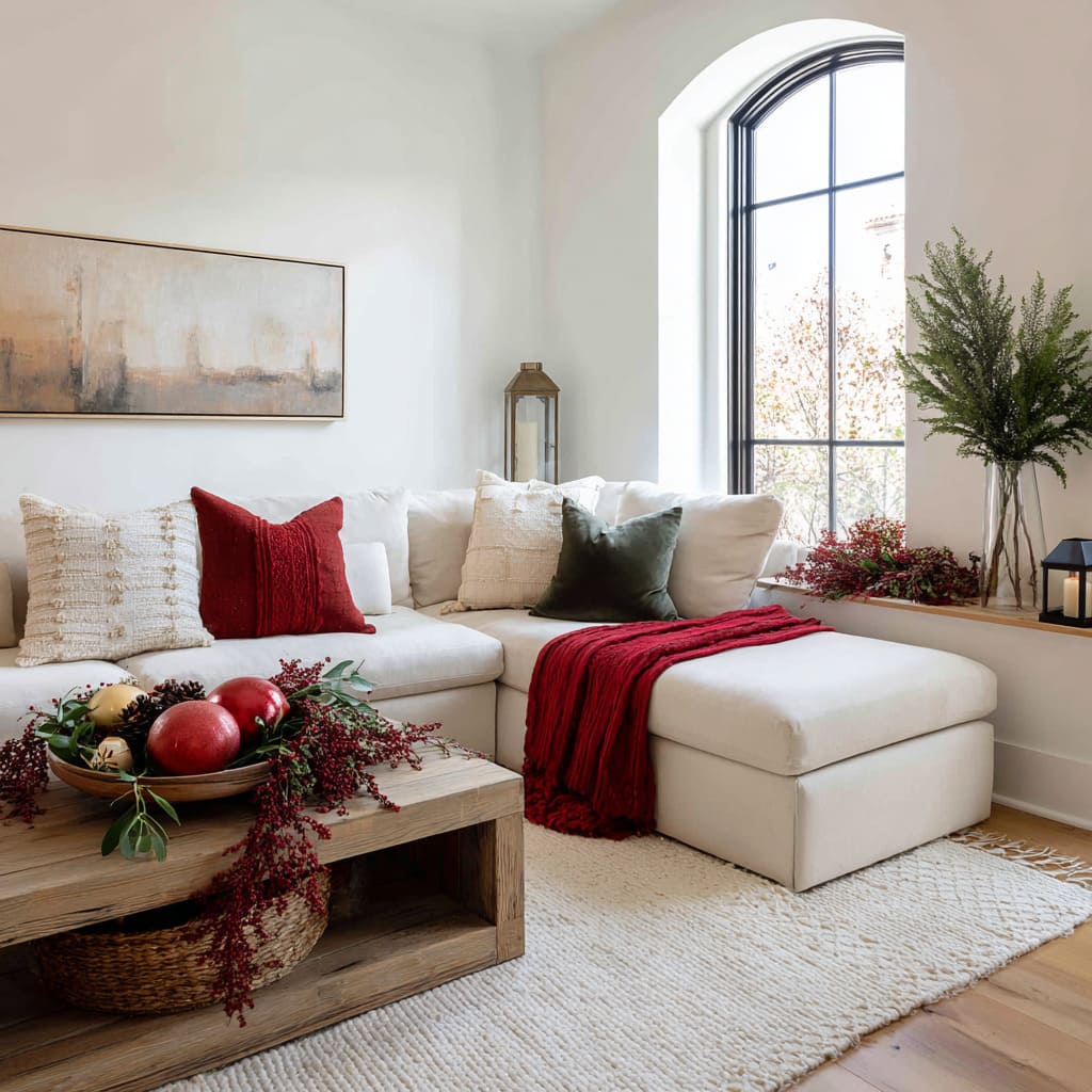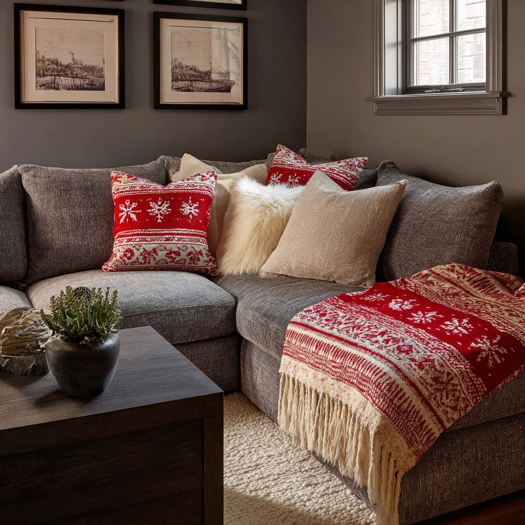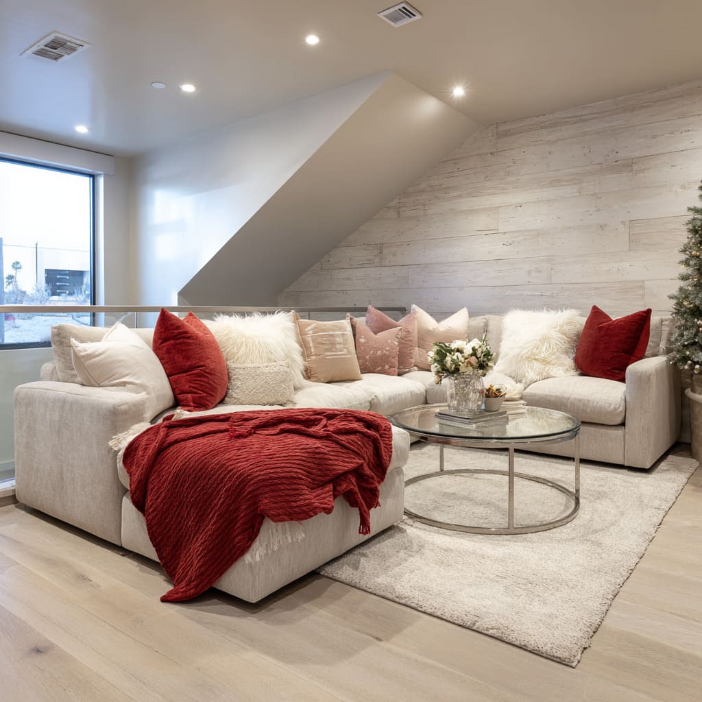 This combination appears in many scenes where the atmosphere is warm, familiar, and calm. A red knit pillow against a cream sofa, paired with wood tones from tables or floors, creates a gentle holiday palette that suits spaces with fireplaces, soft lighting, or traditional millwork.