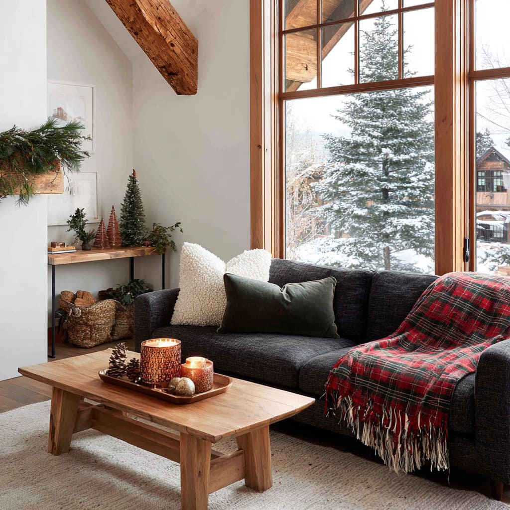 A red throw supports the red berries on the coffee table. A blush blanket supports the pale light coming through snowy windows.