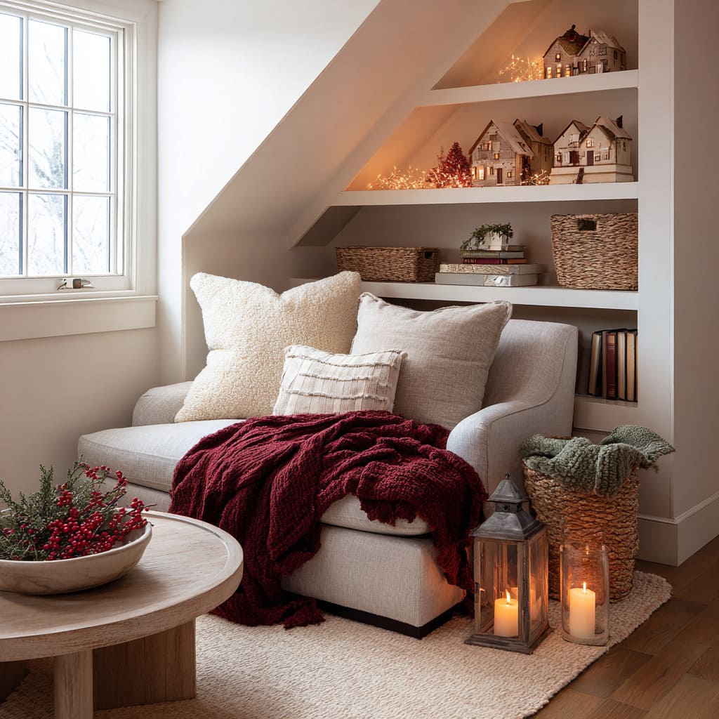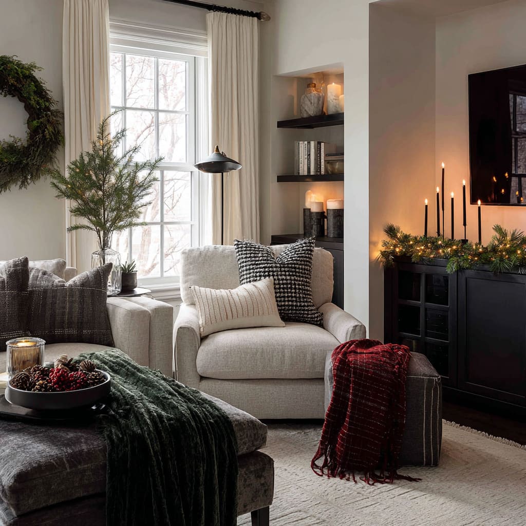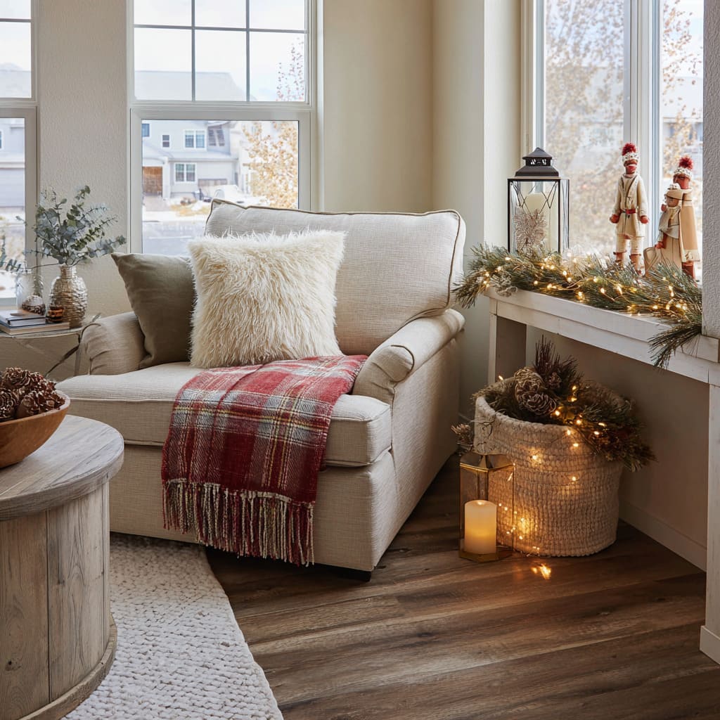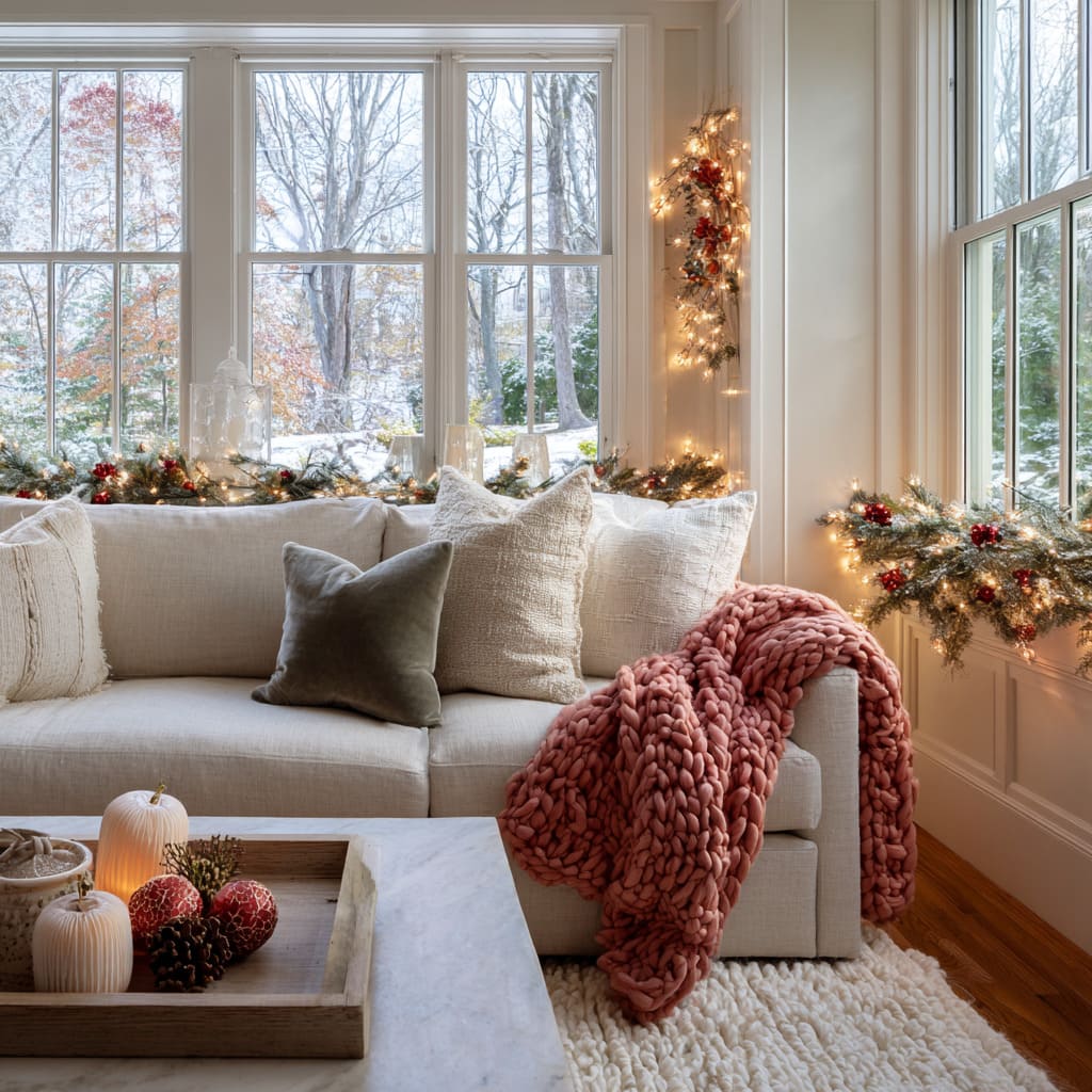 Throws and pillows usually sit in the middle of this vertical stack. By doing so, they visually connect low-glow elements (candles, baskets, ornaments) with higher decor (garlands, wreaths, window silhouettes).