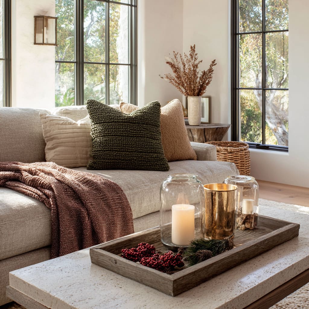 Their scale allows the pillows and throws to stay central while nature provides gentle support. This pairing also supports seasonal palettes: fruit bowls, ornament clusters, dried grasses, small trees, and pine sprigs act as visual bridges between textiles and surroundings.